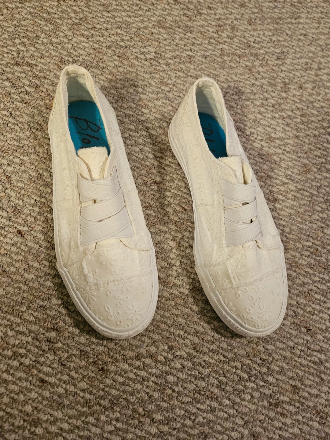 White Bzees slip-on sneakers with an all-over embroidered floral pattern. These casual shoes feature elastic criss-cross straps for easy wear. The bright blue sole adds a pop of colour.