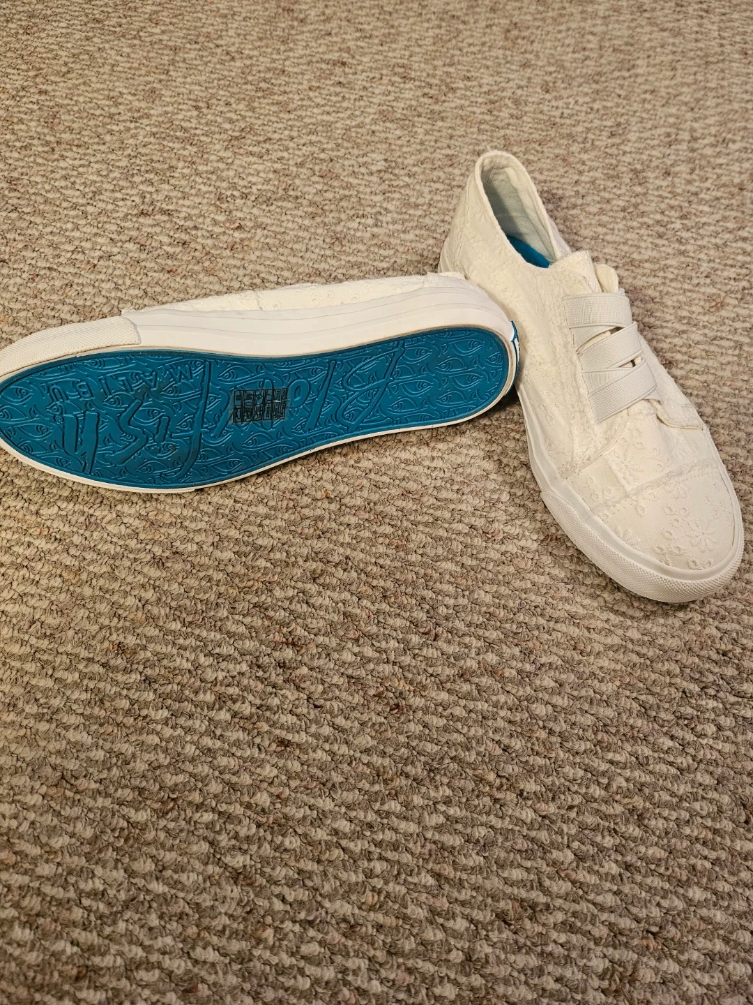 White Bzees slip-on sneakers with an all-over embroidered floral pattern. These casual shoes feature elastic criss-cross straps for easy wear. The bright blue sole adds a pop of colour.