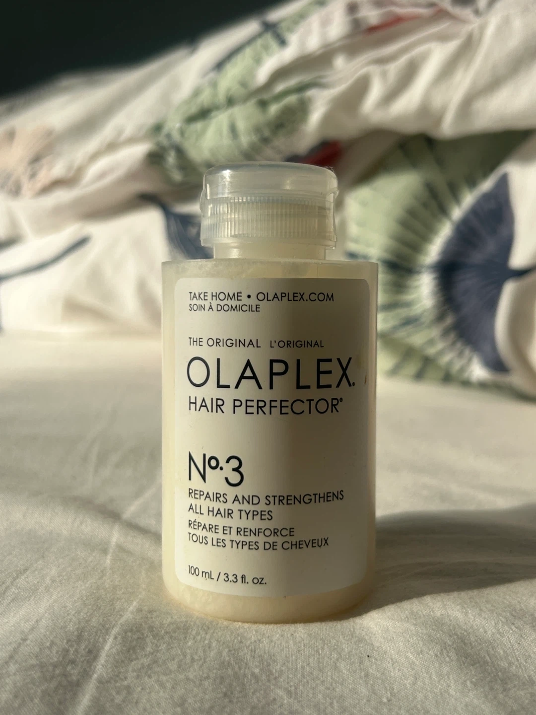 Olaplex No. 3 Hair Perfector is for all hair types. It repairs and strengthens hair. This bottle contains 100 ml, which is 3.3 fluid ounces.