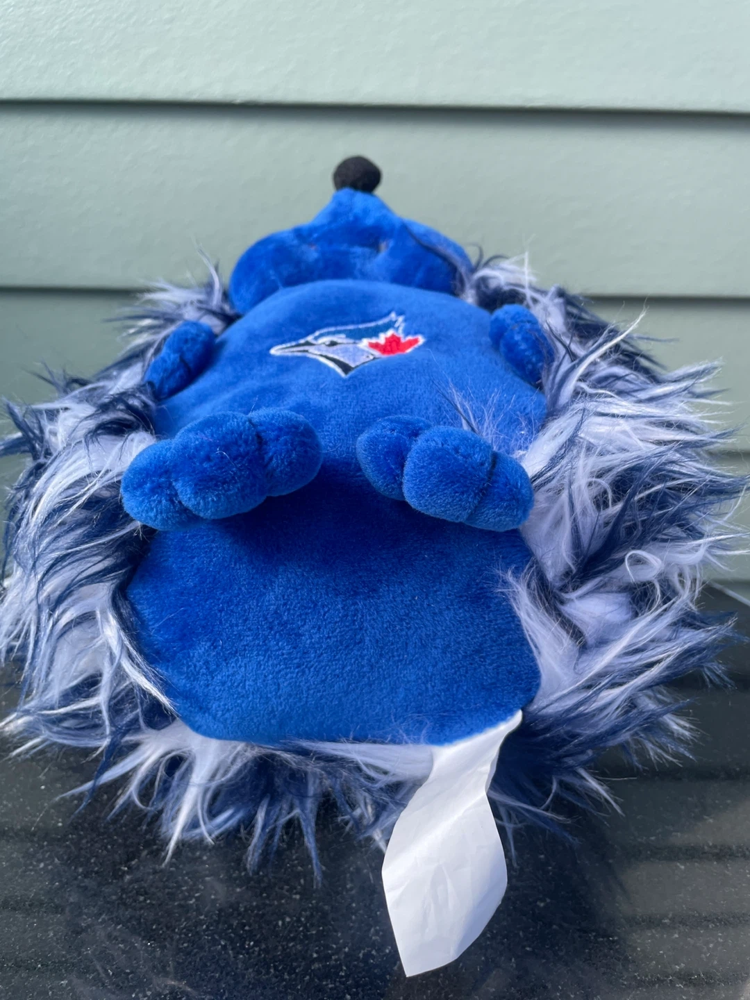Blue fuzzy plush toy with white and dark blue accents. Features the Toronto Blue Jays logo on the belly. Comes with original tags attached. Soft material.