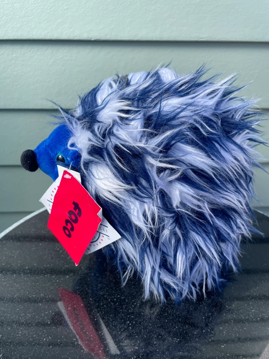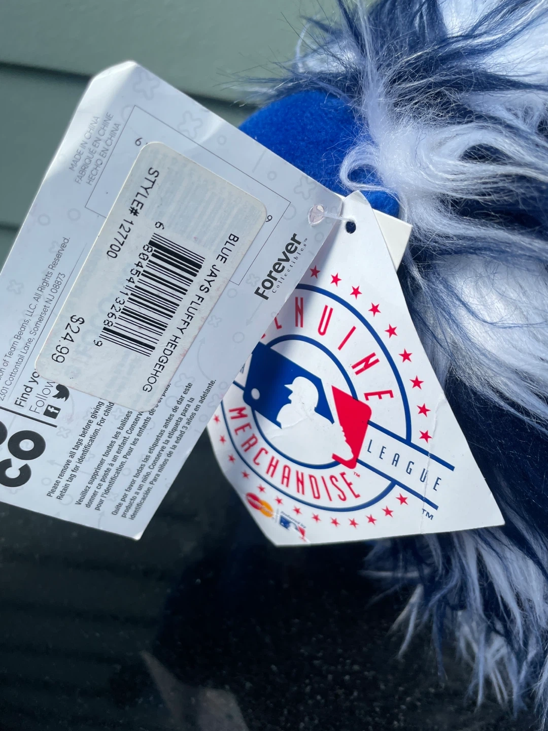 Blue fuzzy plush toy with white and dark blue accents. Features the Toronto Blue Jays logo on the belly. Comes with original tags attached. Soft material.