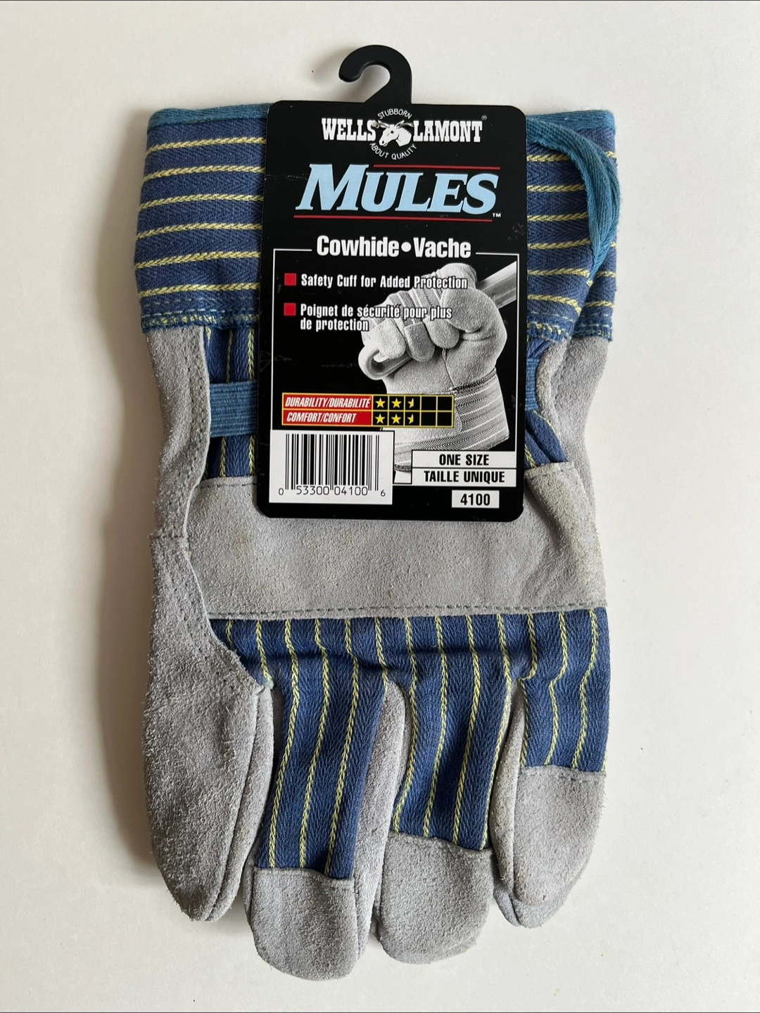 These are a new pair of Wells Lamont Mules cowhide work gloves, designed for durability and comfort in various tasks. Featuring a safety cuff for added protection, these gloves are perfect for any job requiring hand protection.