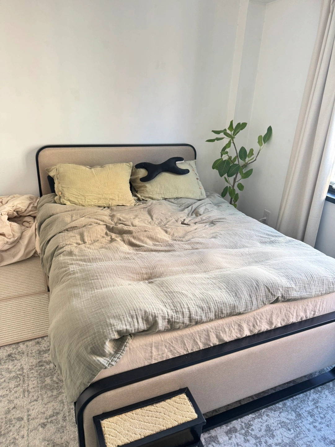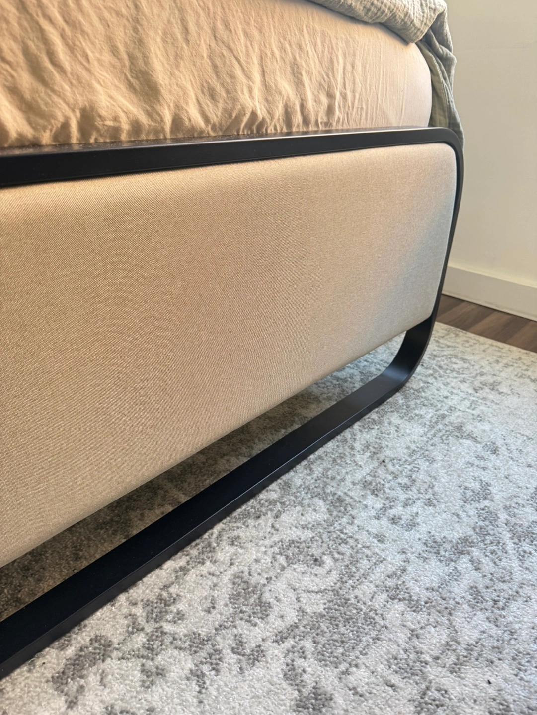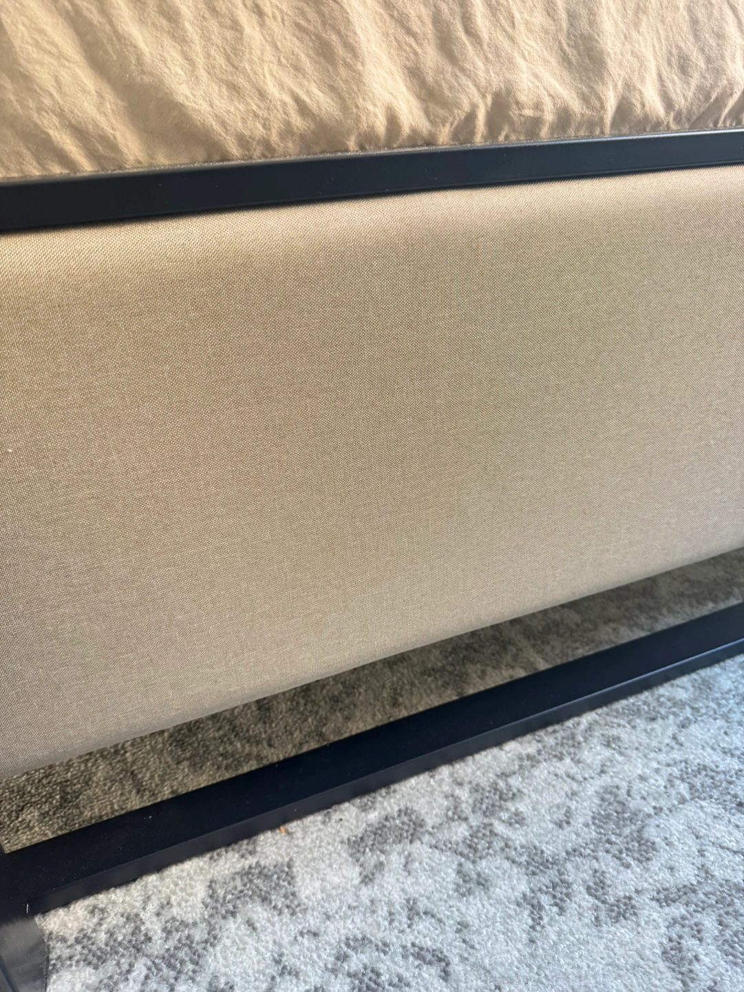 Queen size bed frame. Beige upholstered headboard and black metal frame. Modern style. Minimalist design. Great condition.