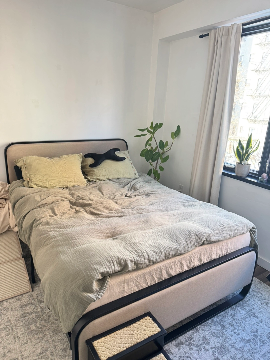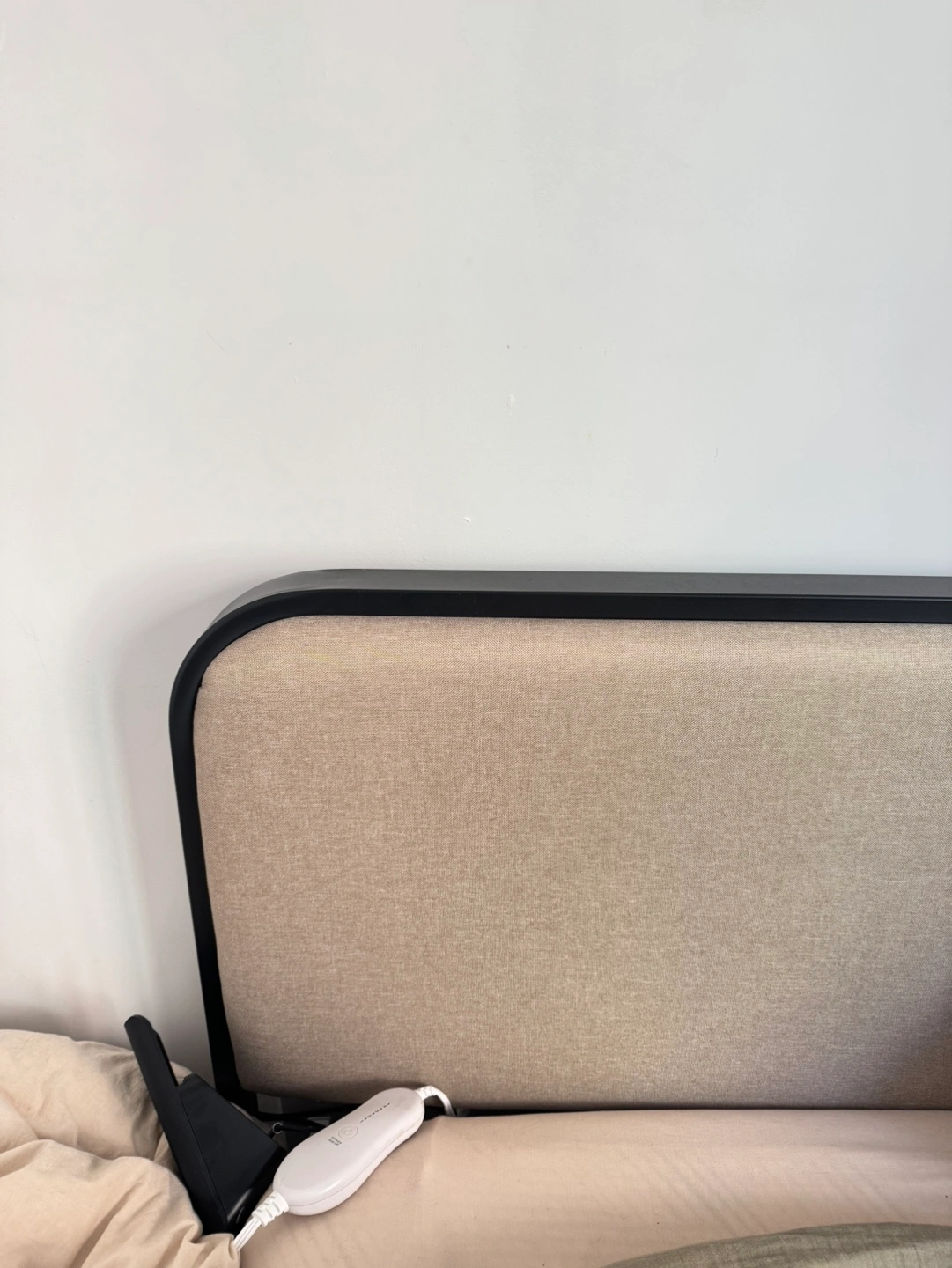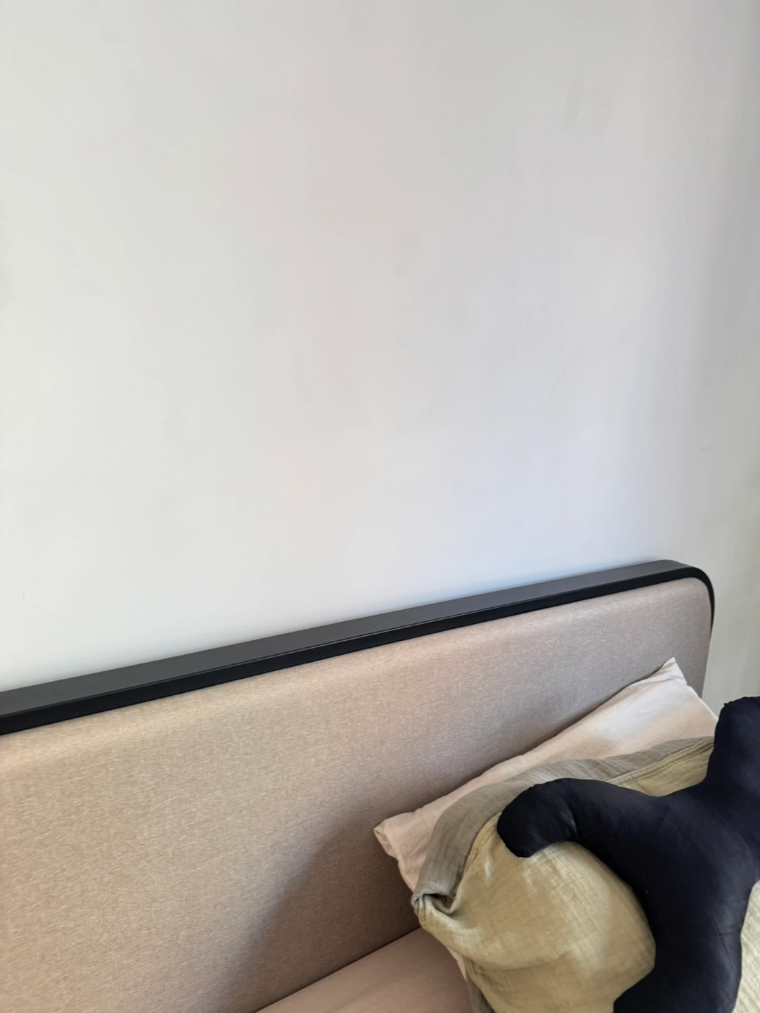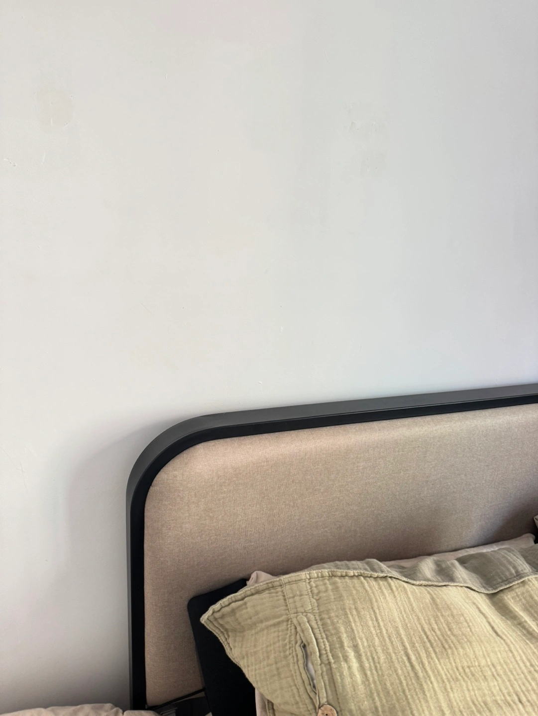 Queen size bed frame. Beige upholstered headboard and black metal frame. Modern style. Minimalist design. Great condition.