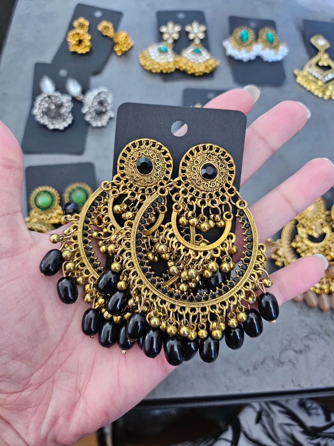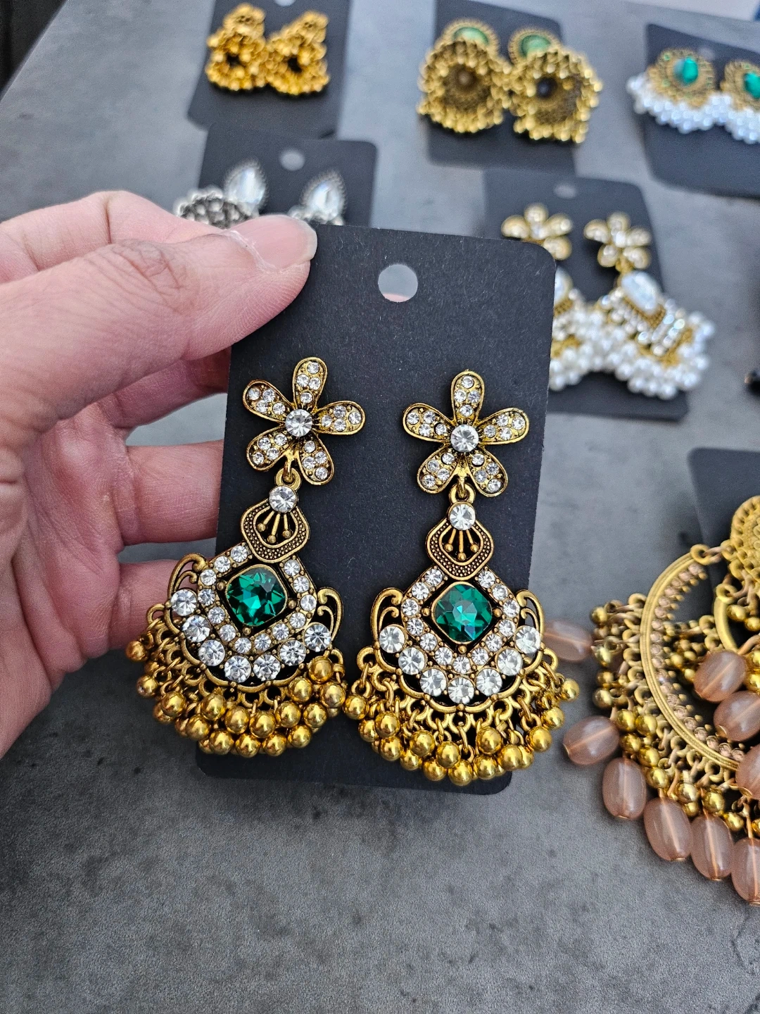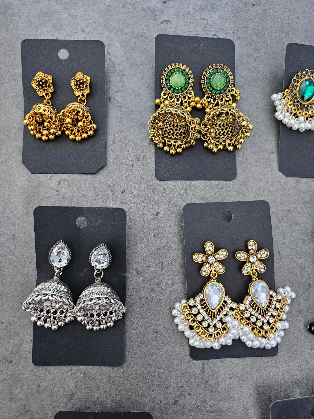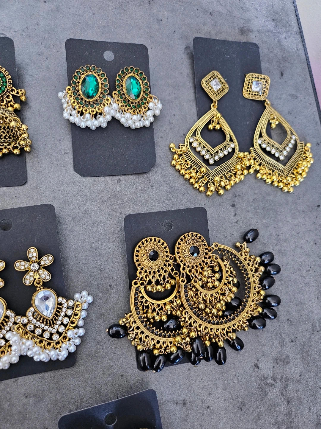 Beautiful collection of Eastern traditional style earrings. Has various designs like classic jhumkas, some with green stones, clear stones, and pearls. Also got some silver ones and big gold hoops with black beads. All new!