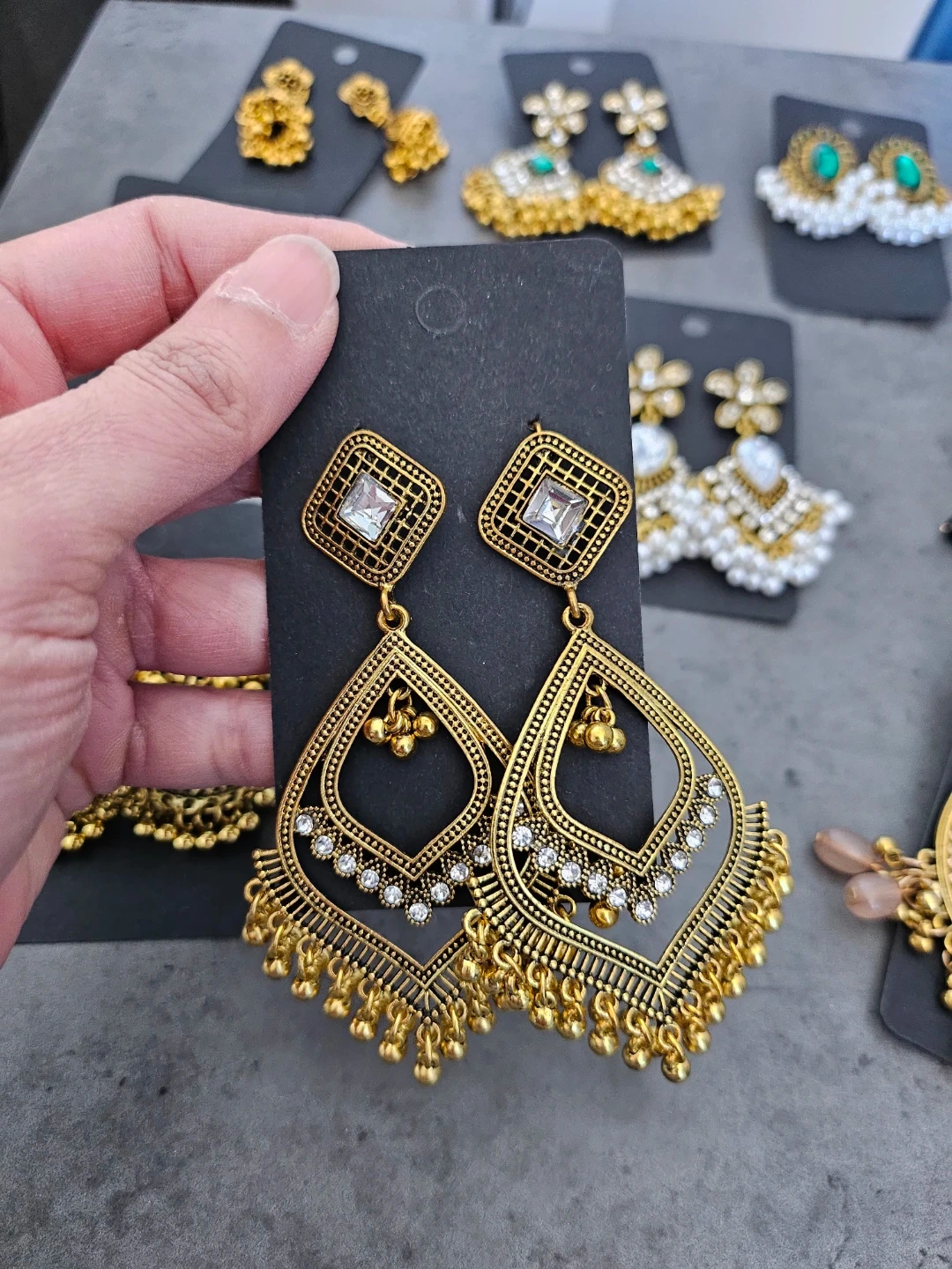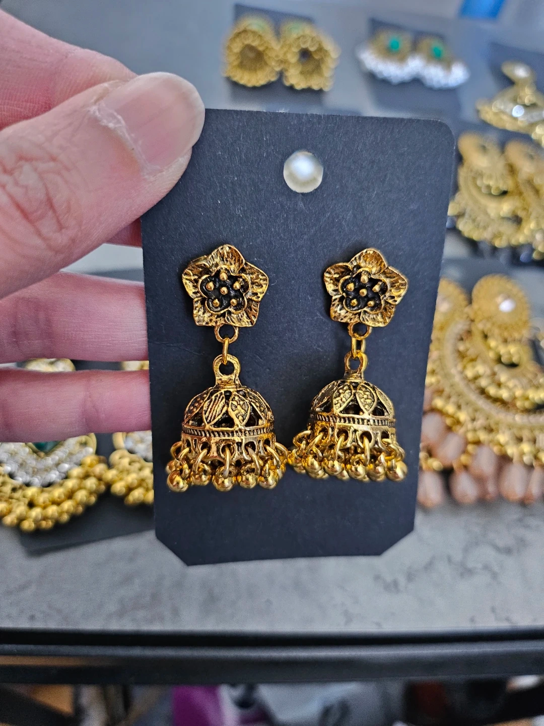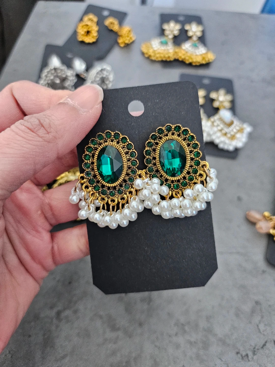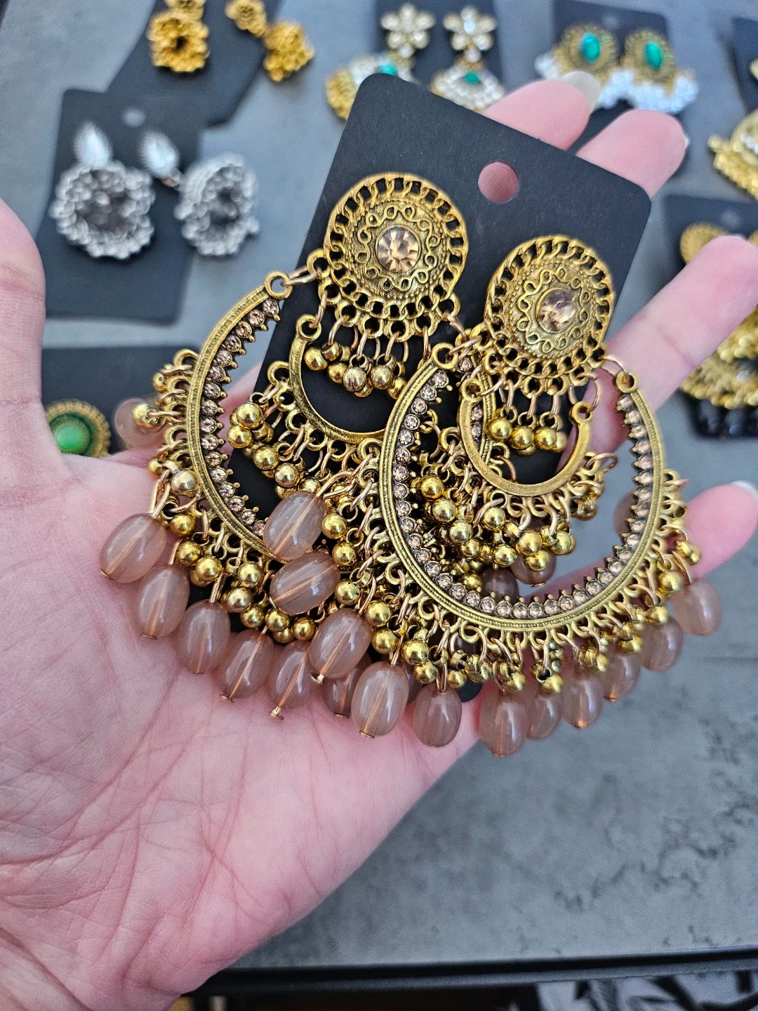 Beautiful collection of Eastern traditional style earrings. Has various designs like classic jhumkas, some with green stones, clear stones, and pearls. Also got some silver ones and big gold hoops with black beads. All new!