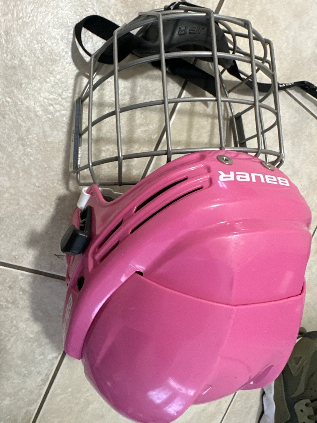 This is a pink Bauer hockey helmet. It's a youth medium size. It comes with a silver cage.