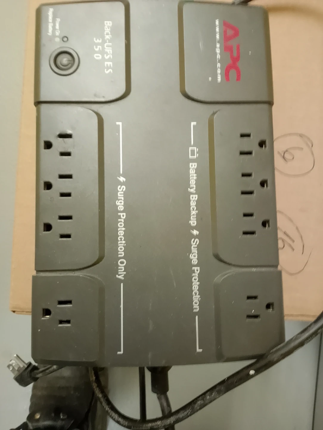 APC Back-UPS ES 350 uninterruptible power supply. It provides battery backup and surge protection for connected devices. Offers surge protection only on some outlets.