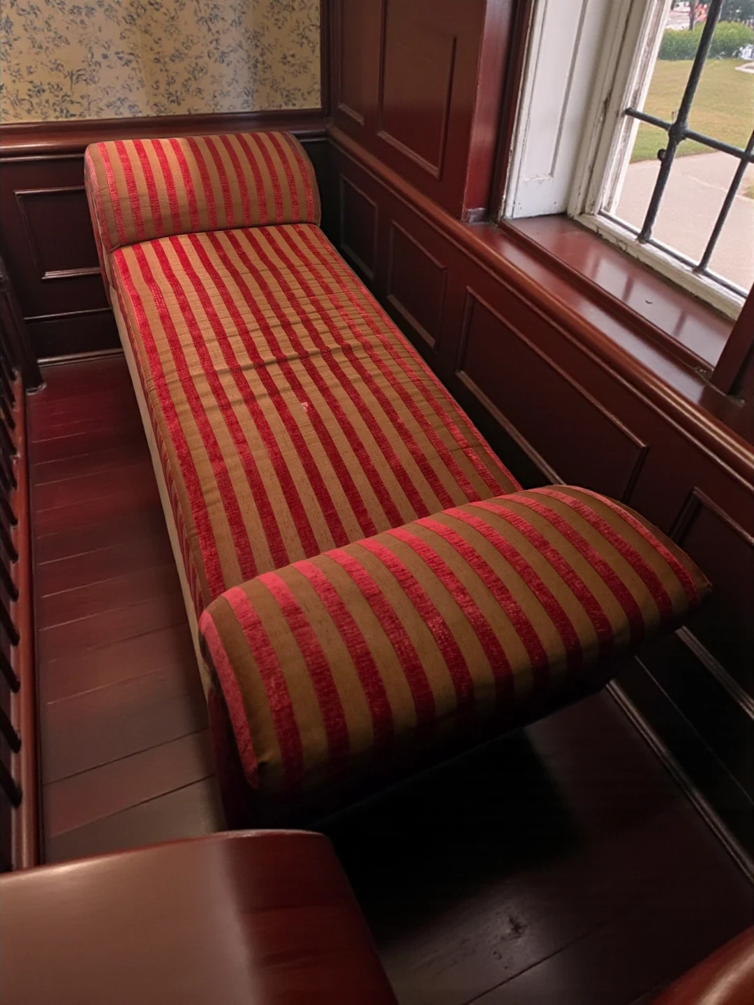 This charming, used front door or bed end bench seat features a striking red and brown striped pattern, adding a touch of elegance to any space. Ideal for use as an accent piece, it combines functionality with vintage flair.