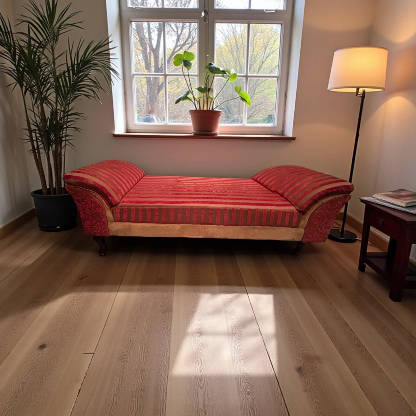 This charming, used front door or bed end bench seat features a striking red and brown striped pattern, adding a touch of elegance to any space. Ideal for use as an accent piece, it combines functionality with vintage flair.