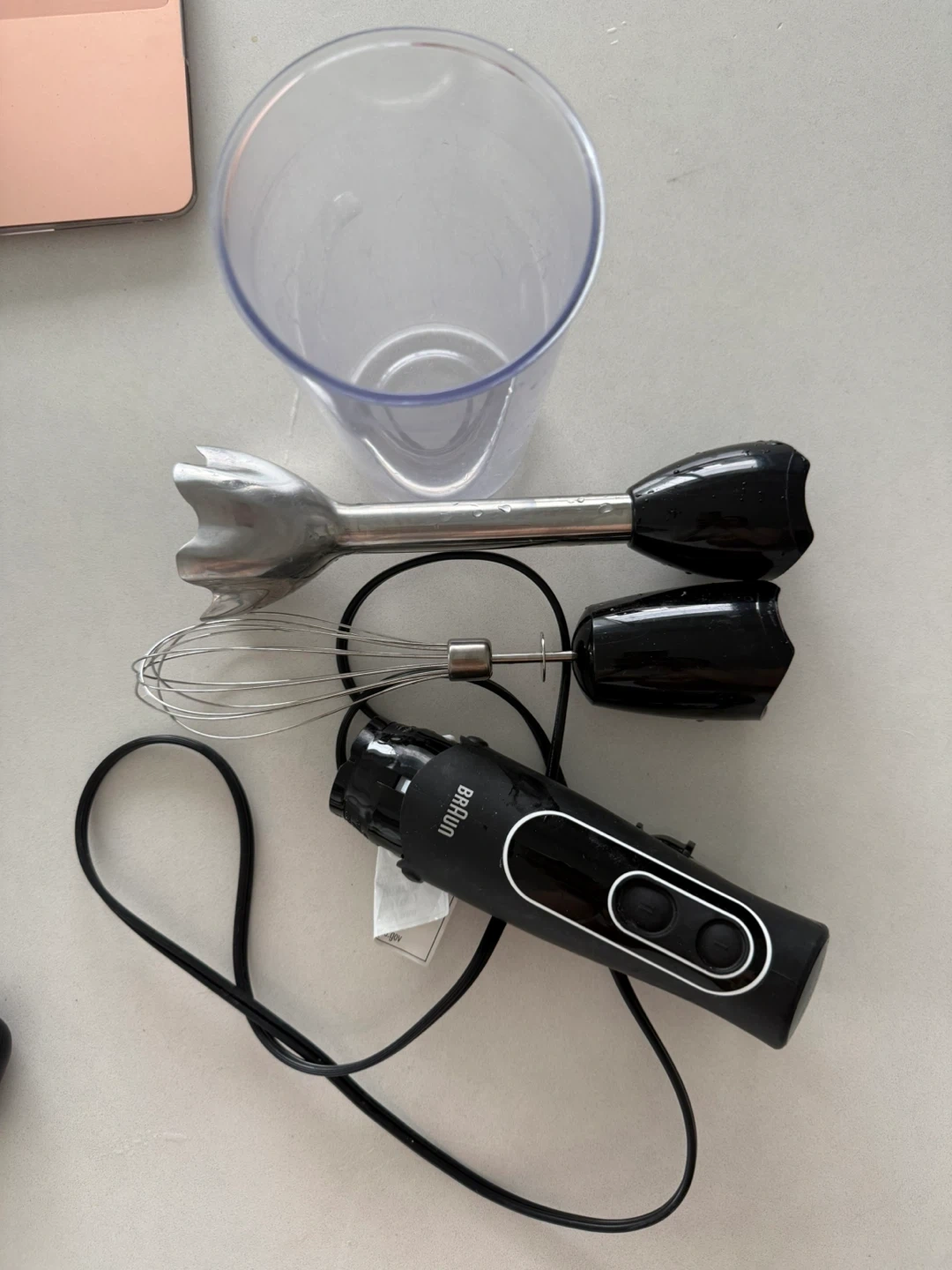 Braun hand blender set including whisk attachment and measuring cup. It's black and comes with a power cord. Great for whipping cream and mixing batters!