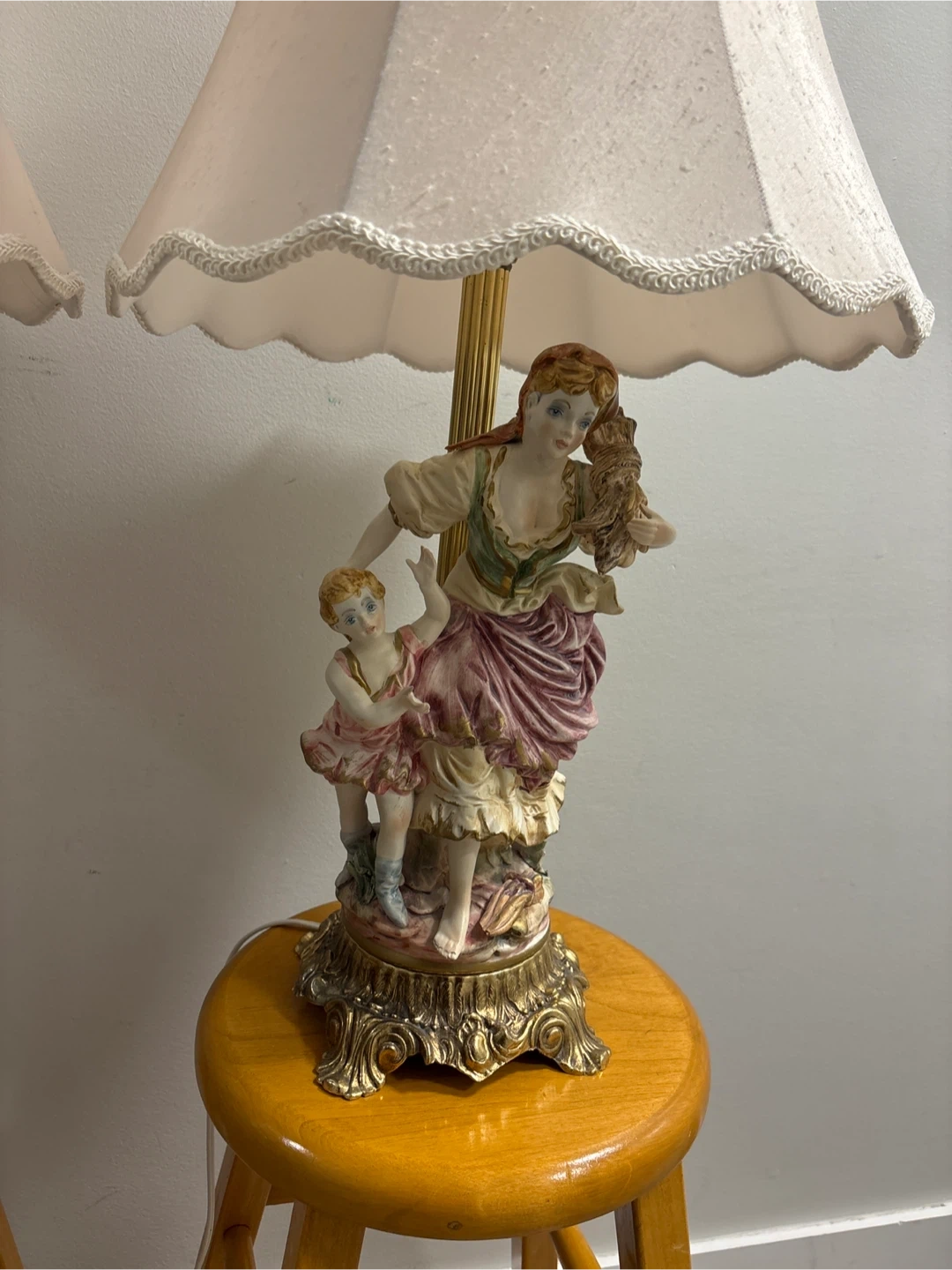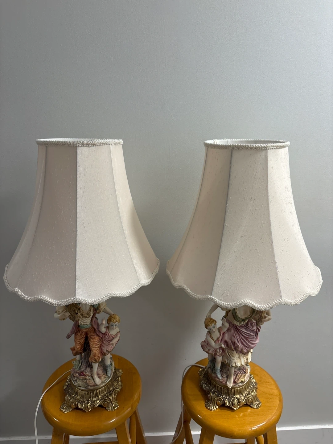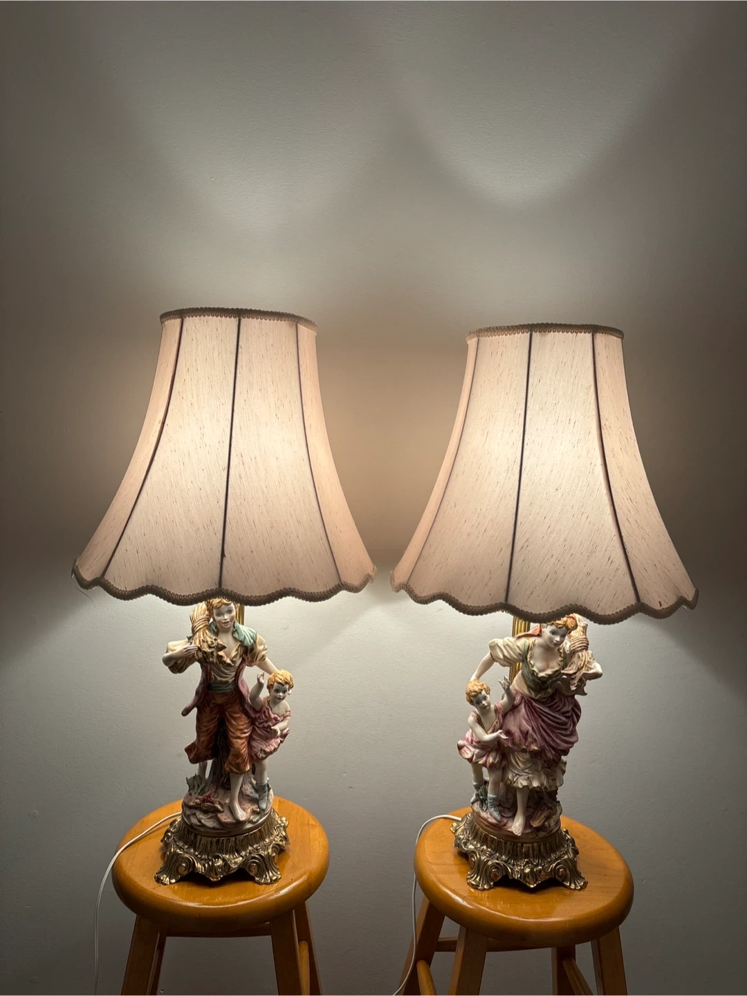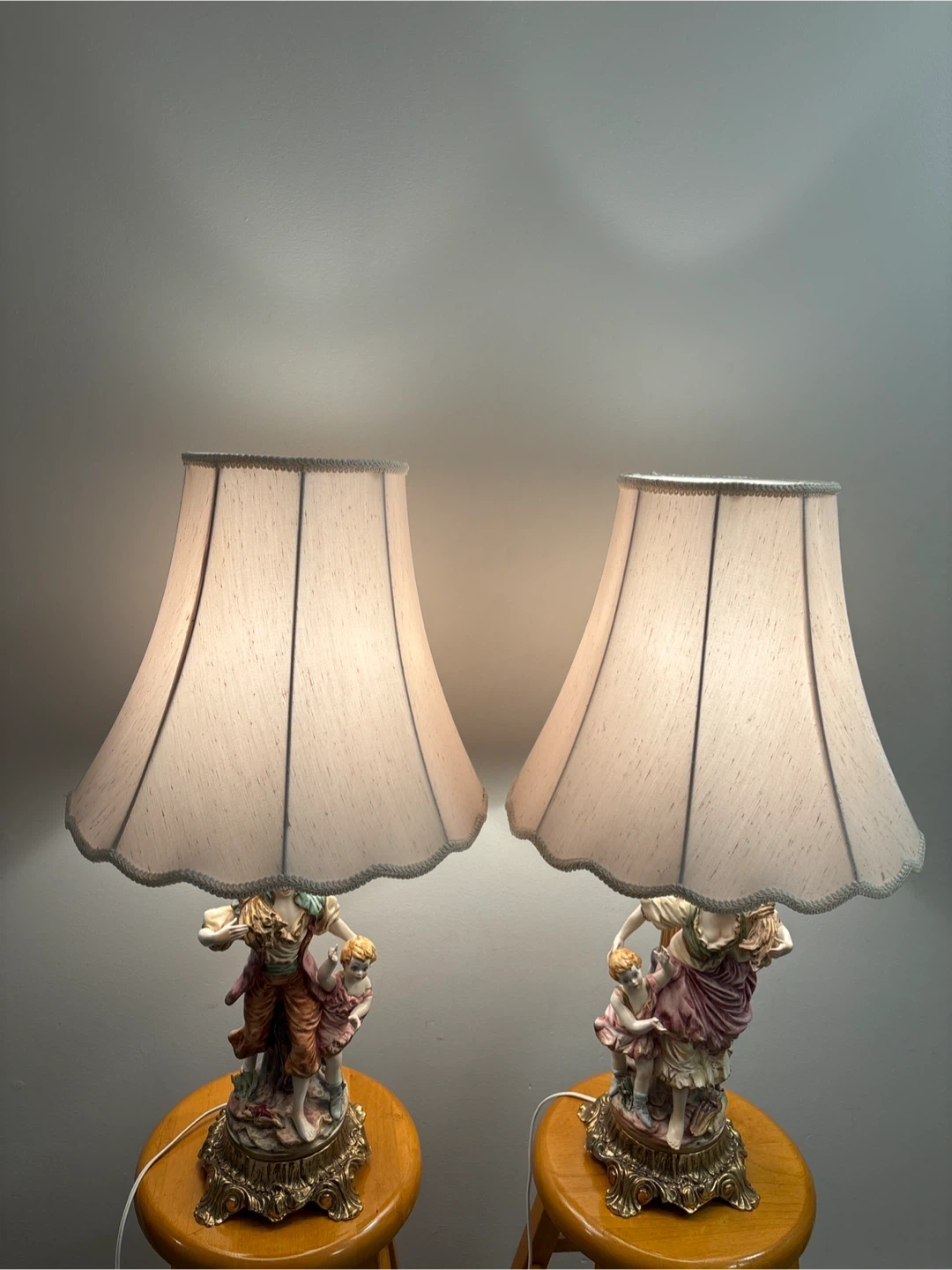 These vintage table lamps feature detailed porcelain figurines of a man a woman and two children, set on ornate brass bases. They come with cream-coloured lampshades that have a scalloped trim. Perfect for adding a classic touch to your living room or bedroom!