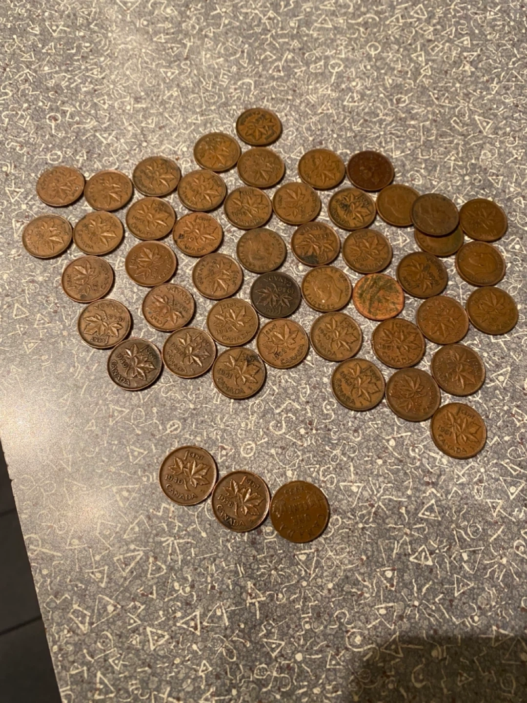 This is a collection of Canadian one-cent coins. The coins feature various Canadian monarchs and maple leaf designs. Years visible include 1935,1938, 1940, and others.