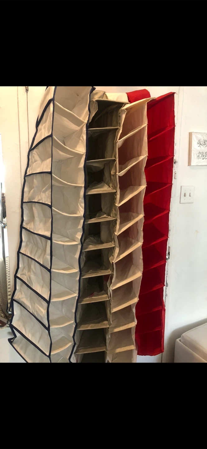 This hanging fabric storage organizer has multiple compartments for storing shoes or other items. It's designed to hang on a door or in a closet. Its fabric construction makes it lightweight and easy to move.