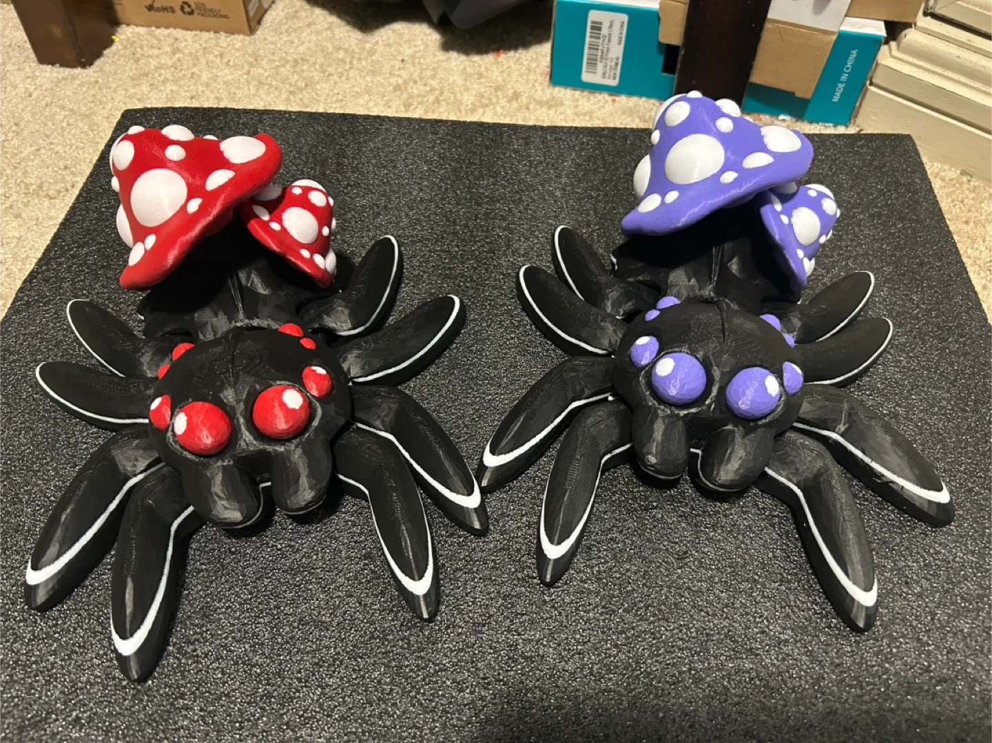 Set of two unique spider figurines, each with a distinctive mushroom cap headpiece. One set features red and white mushroom caps, the other purple and white. They're perfect for adding a quirky touch to your decor! 45 each