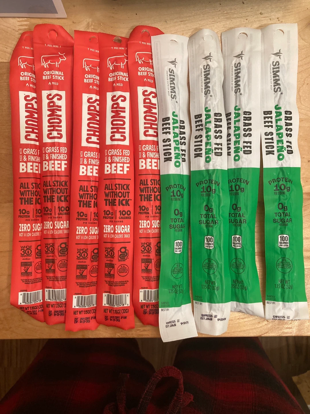 They each contain 10g of protein per serving and are zero sugar. Each stick is 1.15 oz (32g) and comes in a collagen casing.