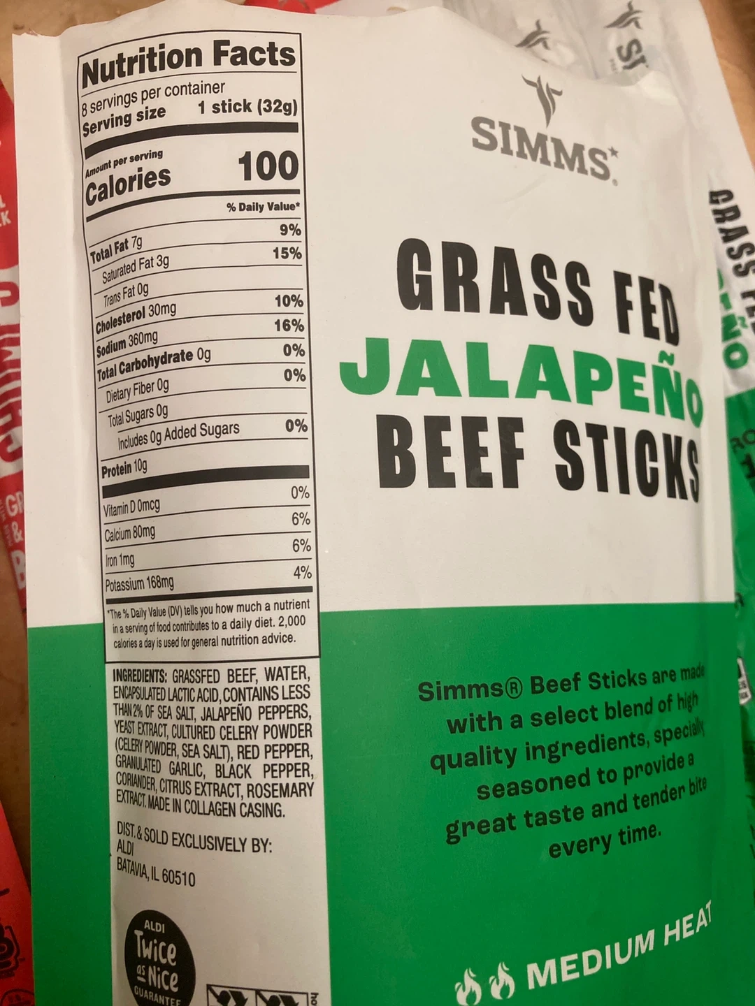 The Simms beef sticks are grass-fed and seasoned with jalapeño.