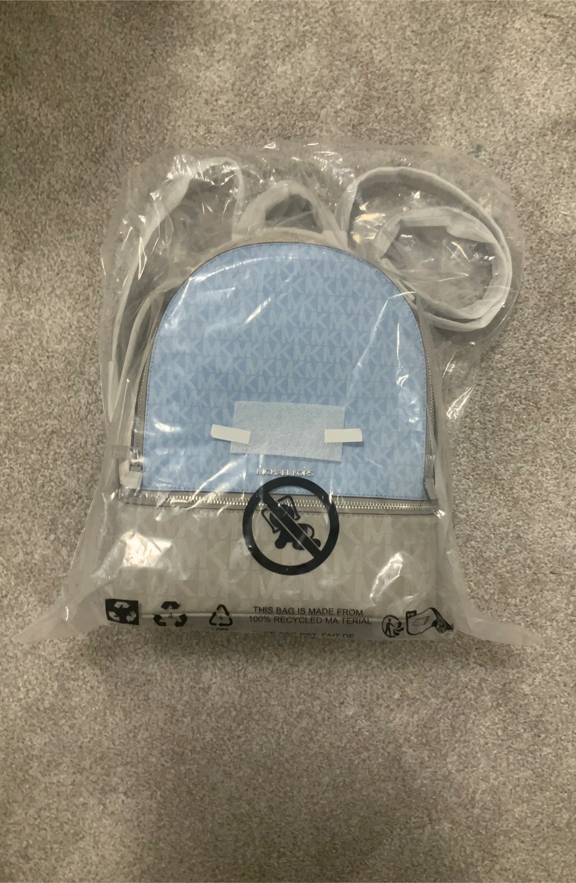 Brand new Michael Kors backpack still in its original packaging! It's a stylish blue and white colour, perfect for everyday use. The bag is made from 100% recycled material