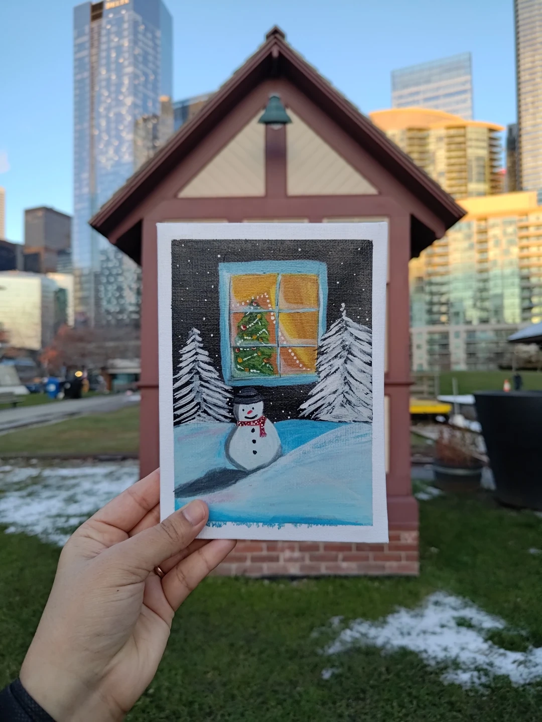A charming acrylic painting on canvas depicts a cheerful snowman outside a window, with a decorated Christmas tree visible inside. Snow-covered trees frame the festive scene, perfect for holiday decor.
