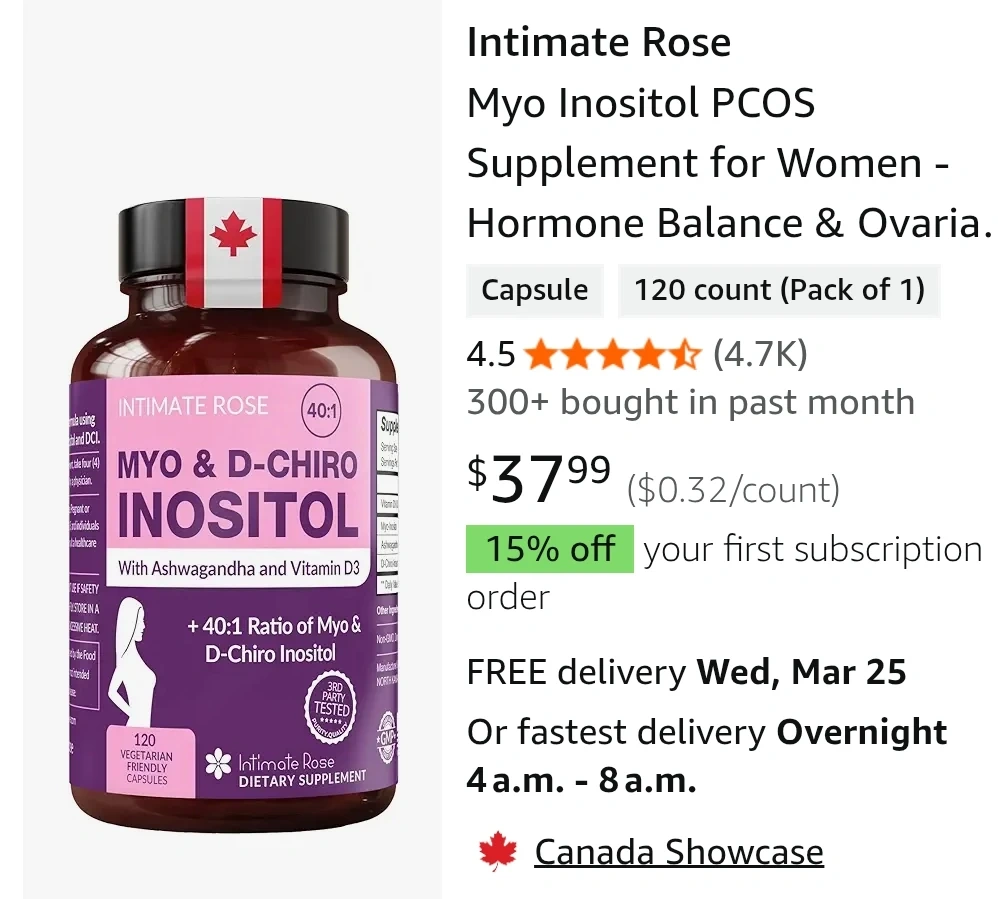 This supplement from Intimate Rose contains Myo and D-Chiro Inositol with Ashwagandha and Vitamin D. It's formulated for hormonal, ovarian, and reproductive support, plus daily stress support. The expiry date is February 2027. It's a 120 vegetarian capsule count.