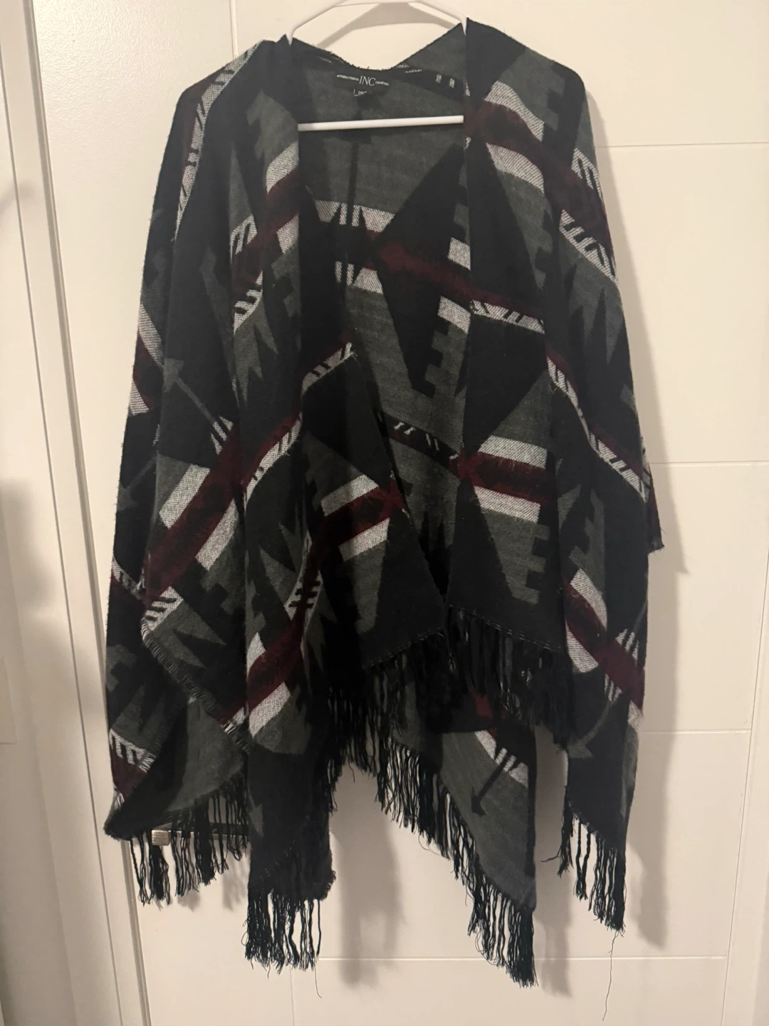 INC International Concepts poncho with a geometric pattern. OS/TU sizing. Black, grey, white, and burgundy colours. It's fringed along the bottom edges for added detail.
