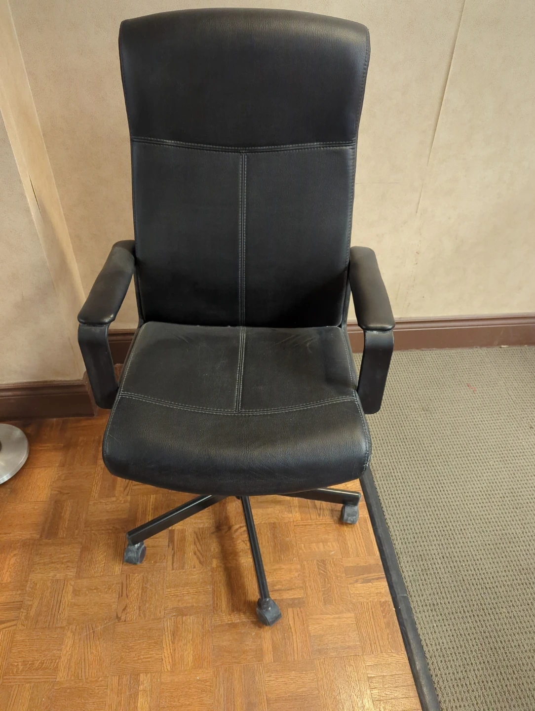 This is a black office chair with a high back and padded arms. It's upholstered in what appears to be faux leather. The chair has a swivel base with casters for mobility.