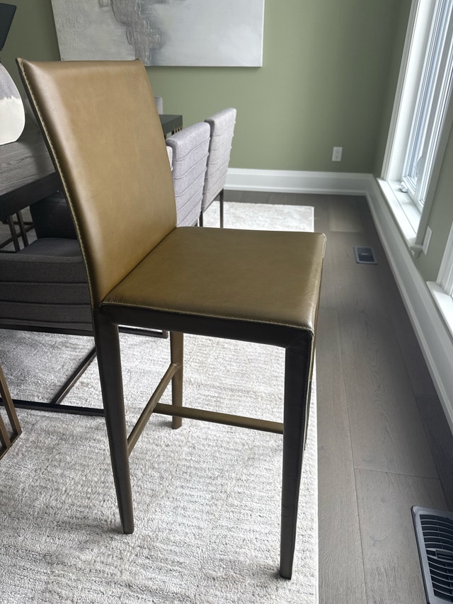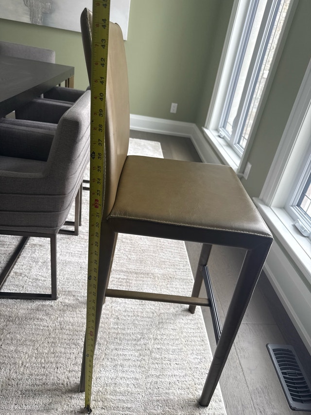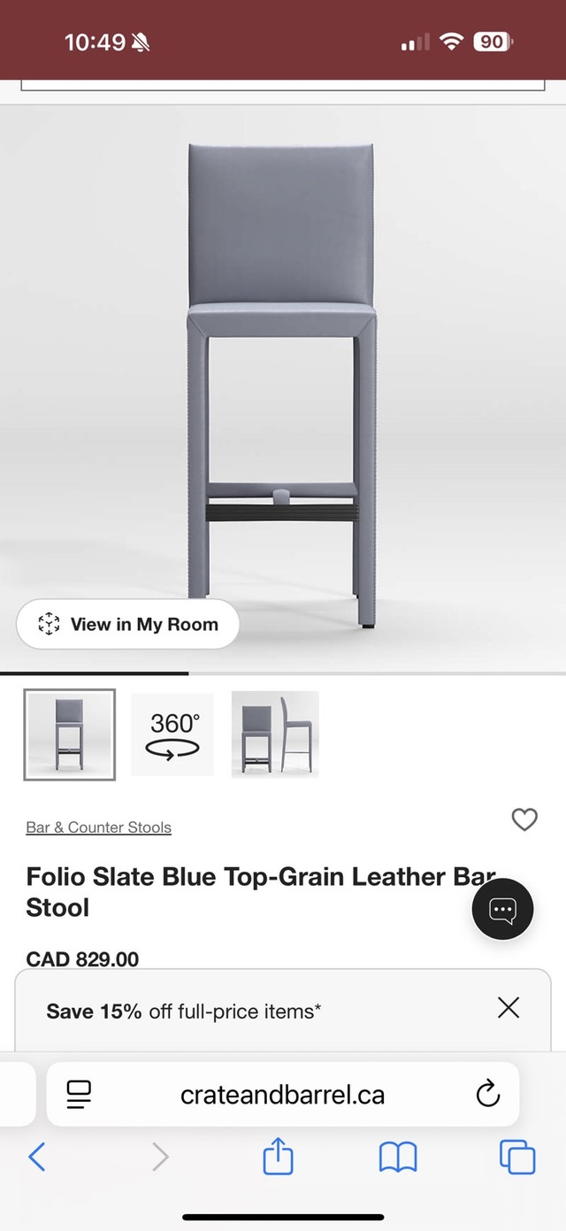 Selling a pair of Crate and Barrel Folio Top-Grain Leather Bar Stools in slate blue. These are high-quality stools with a sleek design, inspired by Italian aesthetics and featuring clean Parsons-style lines. Each stool has a comfortable foam-cushioned seat and a subtly curved back, upholstered in top-grain leather. The metal legs provide a sturdy base, and there's a grooved footrest with a protective cover. Original price was $829 each. Selling for $600 each. Seat height is 30 inches, and seat width is 17 inches. These are used but in good condition. Cash accepted.