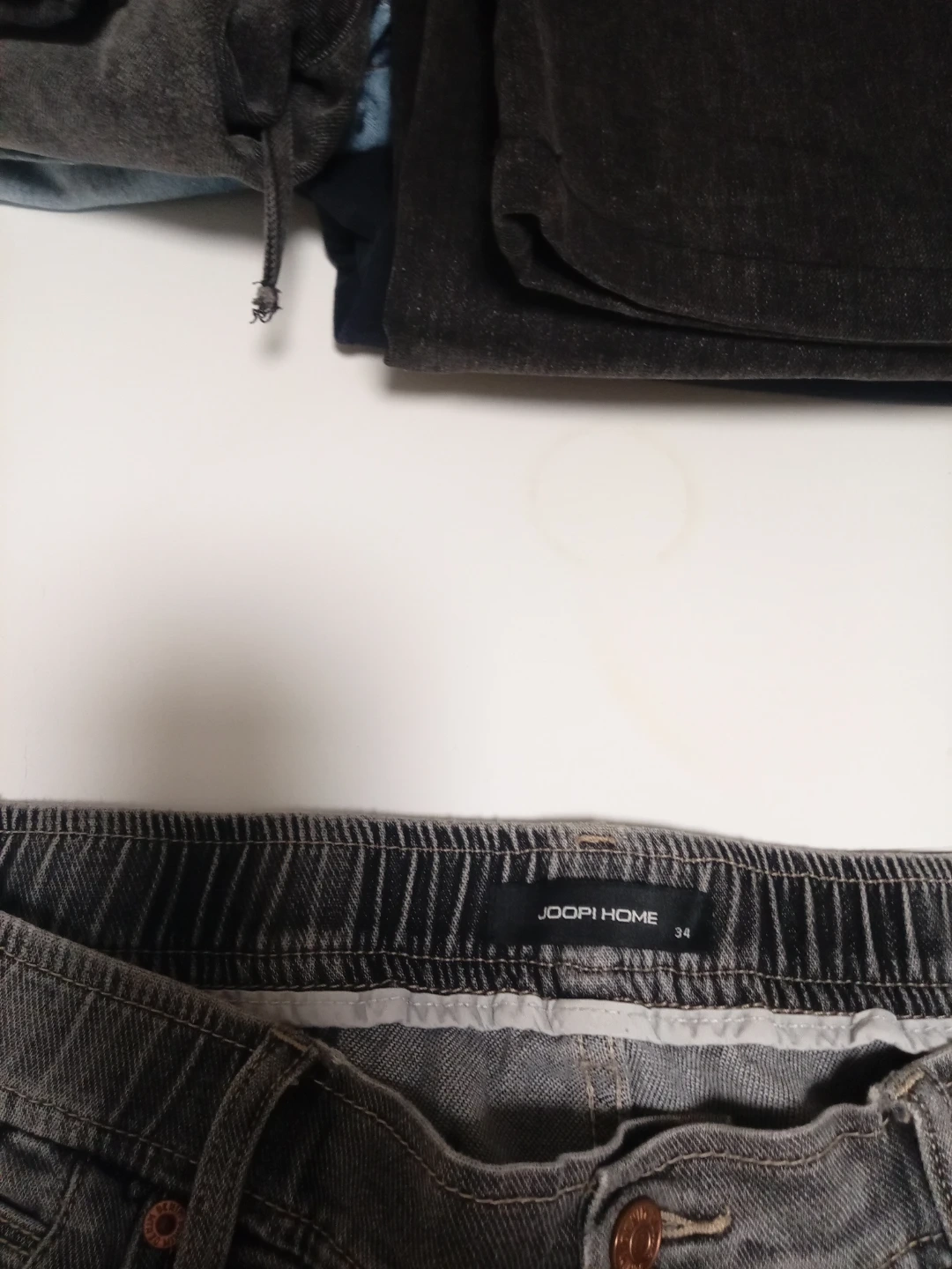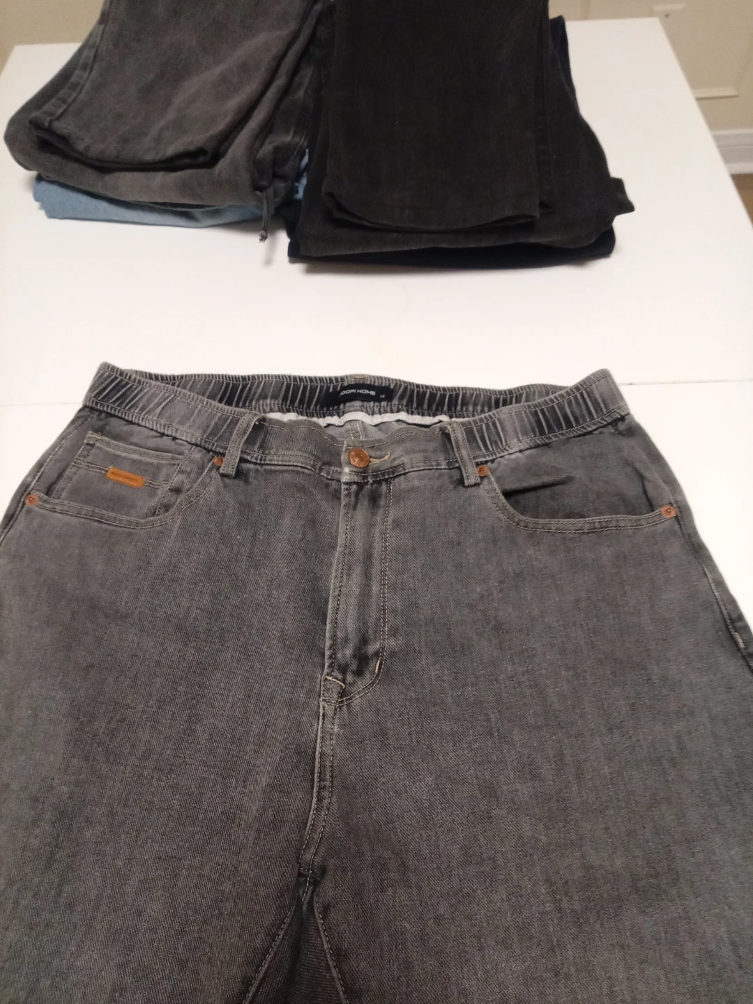Classic grey wash denim jeans with an elastic waistband for comfort. These pants feature a traditional five-pocket design, including two back patch pockets. Made from durable denim material.