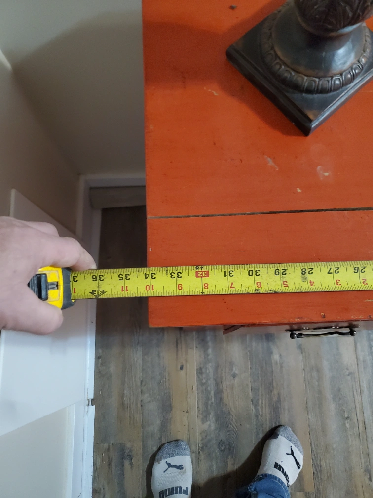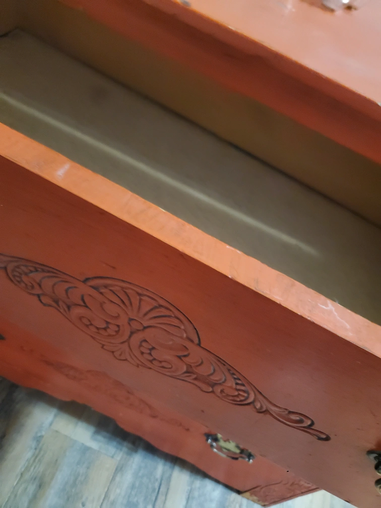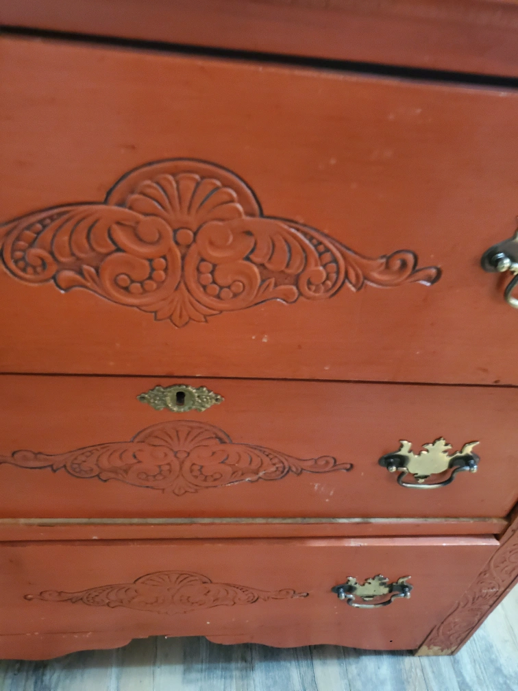 Three-drawer dresser. Intricate carved detailing. Orange paint finish. Brass drawer pulls. Shows some wear consistent with age and use. Great vintage piece.