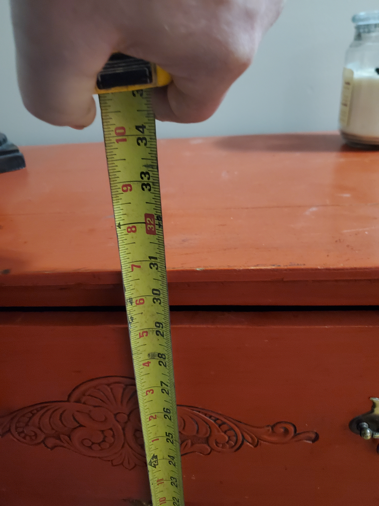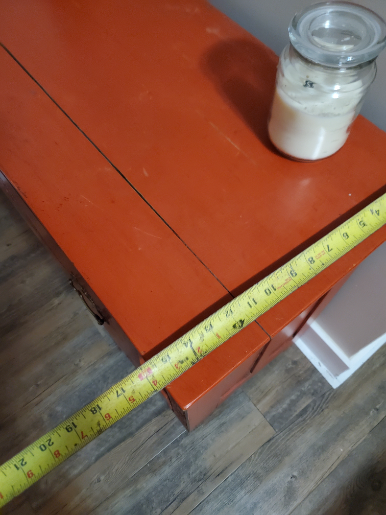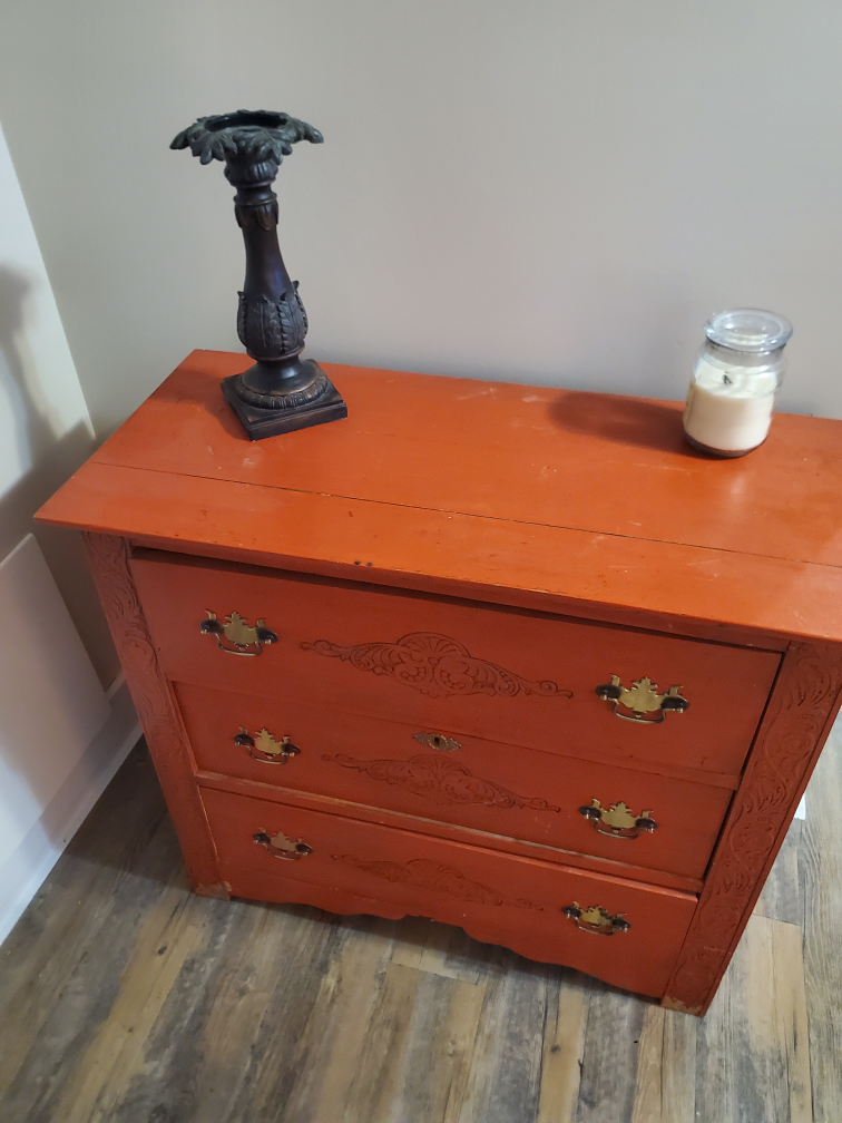 Three-drawer dresser. Intricate carved detailing. Orange paint finish. Brass drawer pulls. Shows some wear consistent with age and use. Great vintage piece.