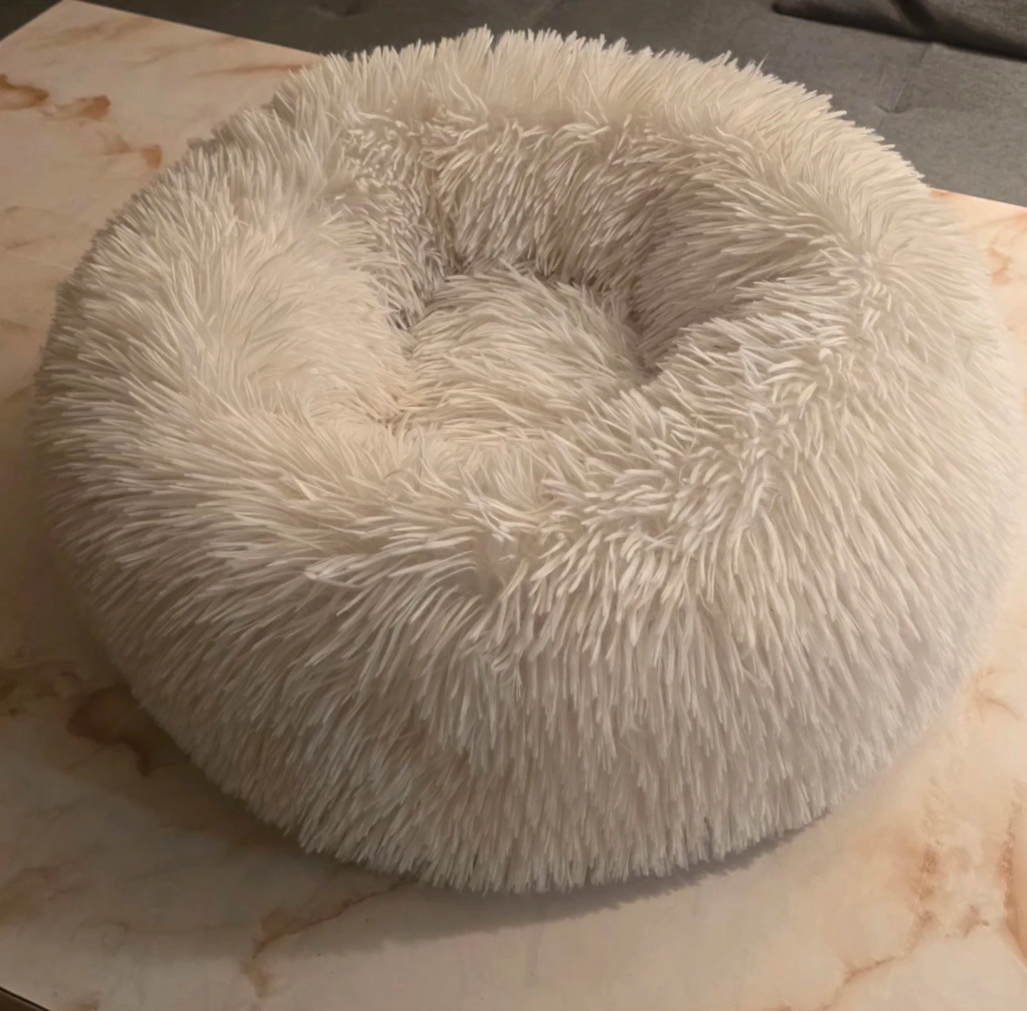 Super soft and cosy round pet bed. It's made with a plush, fluffy material that's calming for pets. Provides a comfortable spot for your furry friend to rest. Great for small to medium-sized pets!