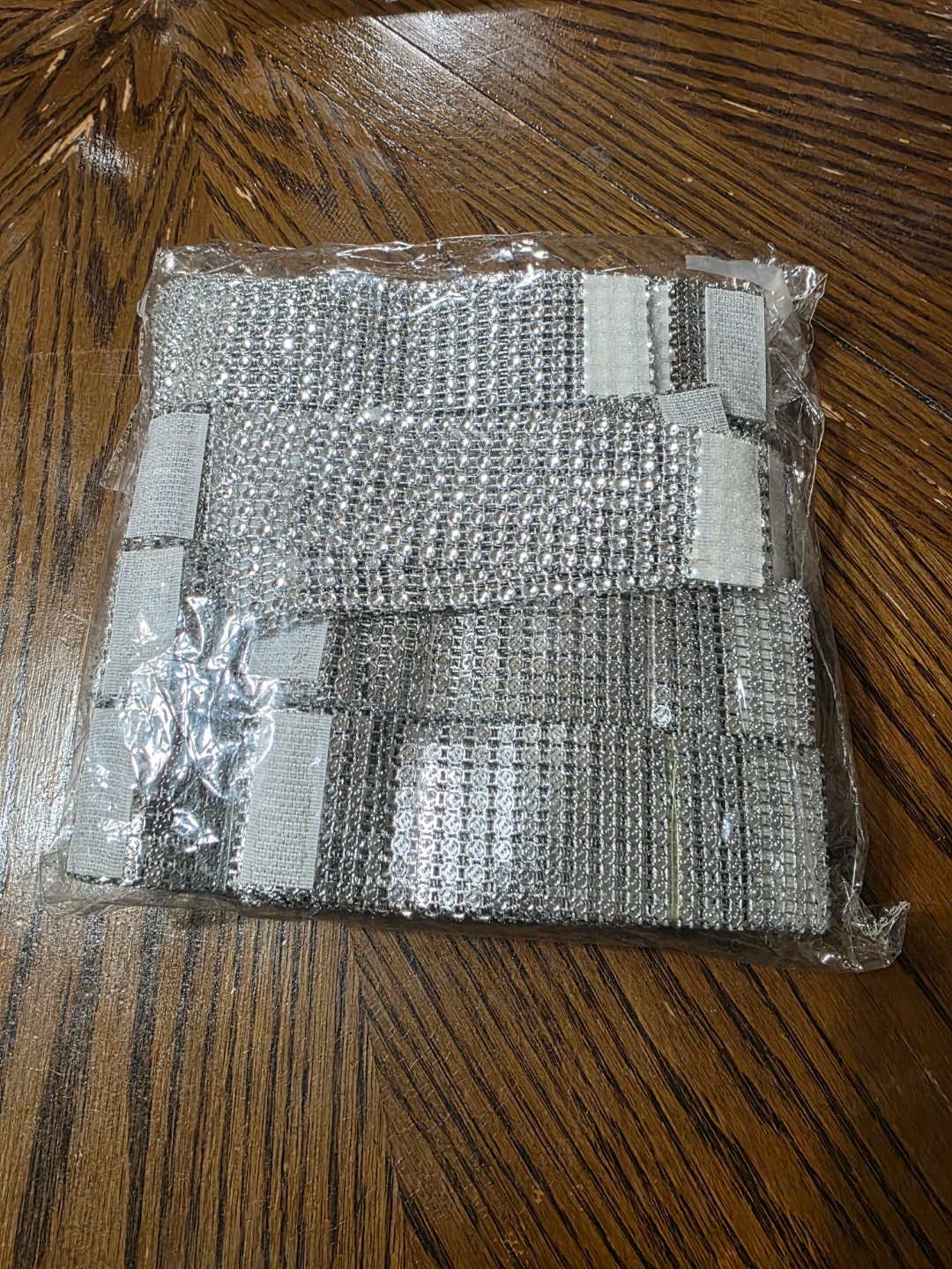 Comes with several rolls of silver rhinestone ribbon. It's great for crafts and decorations. Each ribbon has a self-adhesive backing for easy application. Use it to add sparkle to cakes, candles, or other items!