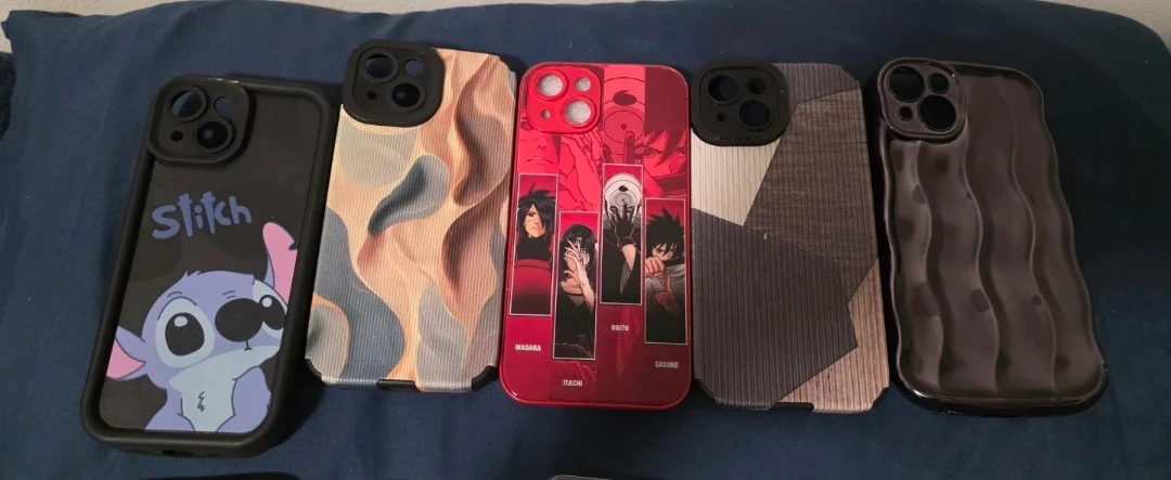 Variety of phone cases for iPhone 15, featuring Stitch, Naruto characters, Harry Potter designs, and abstract patterns. Protect your phone in style!