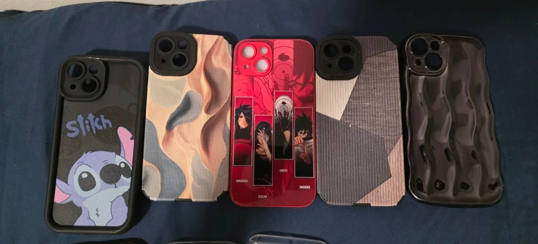 Variety of phone cases for iPhone 15, featuring Stitch, Naruto characters, Harry Potter designs, and abstract patterns. Protect your phone in style!