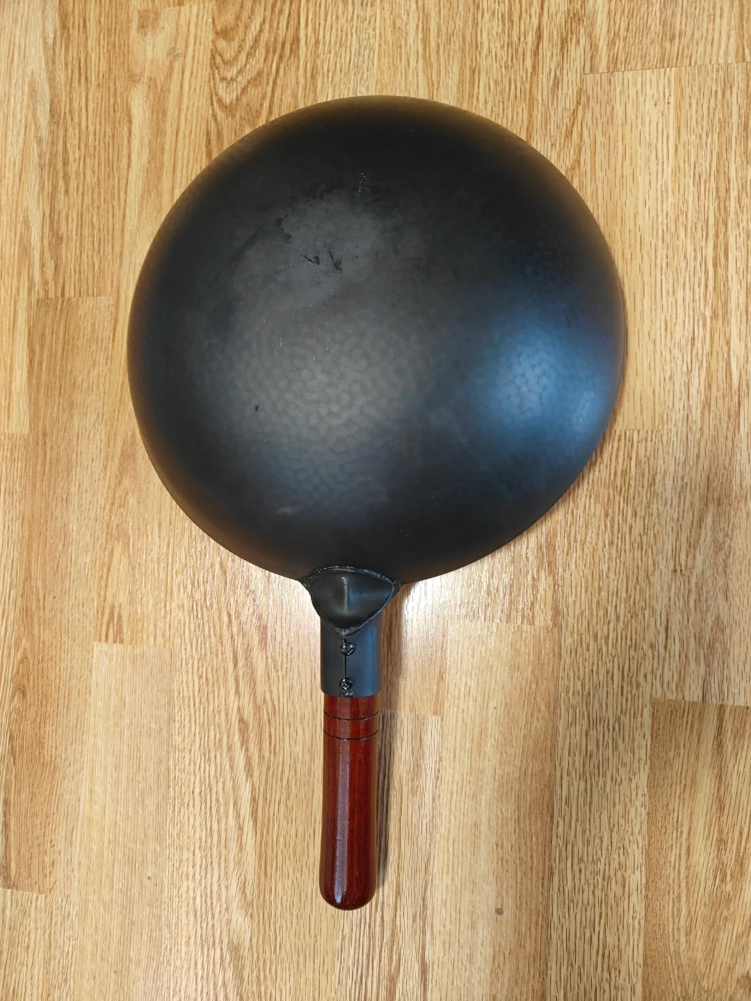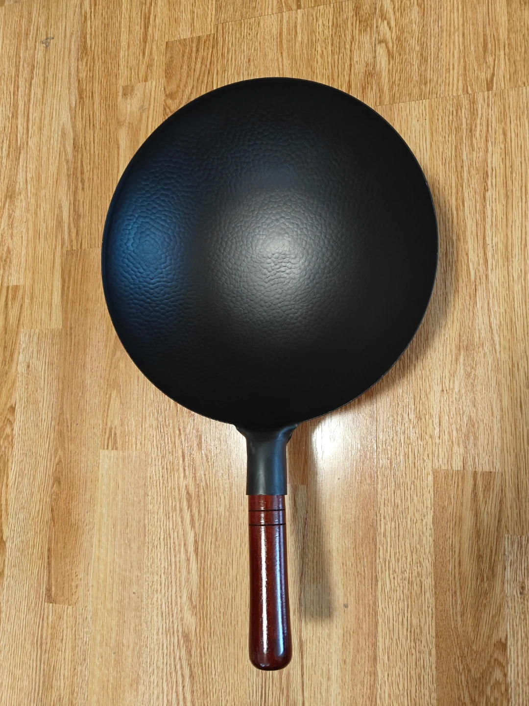 A black wok pan featuring a hammered texture. It has a sturdy wooden handle for comfortable grip. This pan is ideal for stir-frying and other Asian cuisine preparations.