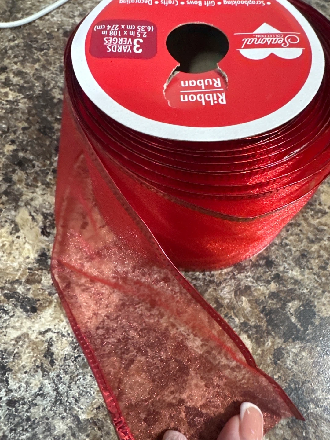 This is a roll of red ribbon from the Seasonal Collection. It's 2.5 inches wide and 108 inches (3 yards) long. Perfect for scrapbooking, gift bows, crafts, and decorating!
