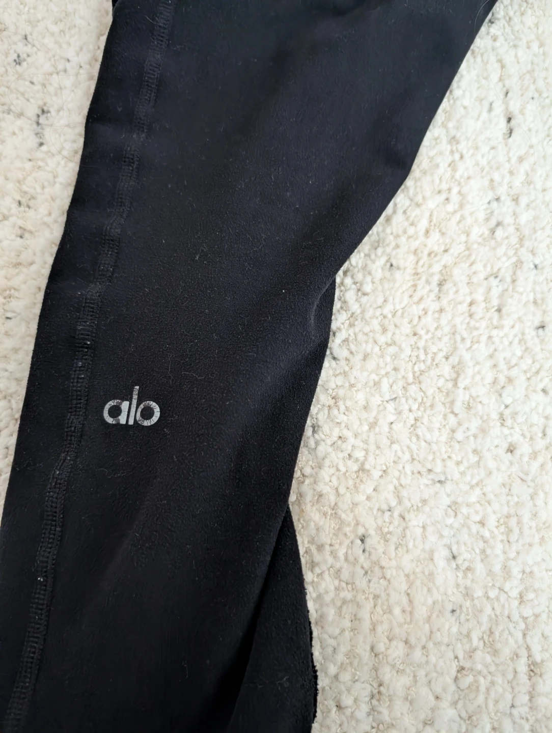 Alo Yoga black leggings, perfect for your yoga practice or everyday wear. Made with a blend of polyester and spandex for a comfortable fit. Designed in Los Angeles and made in Vietnam.