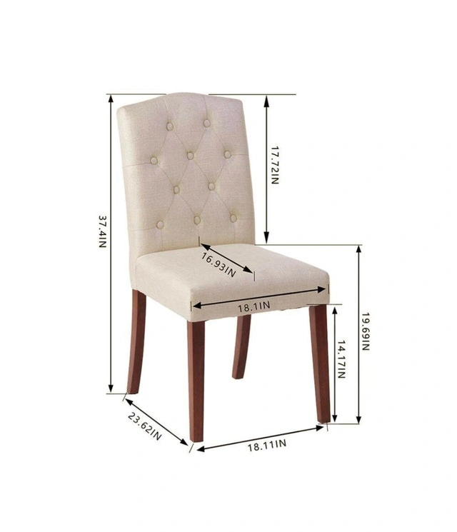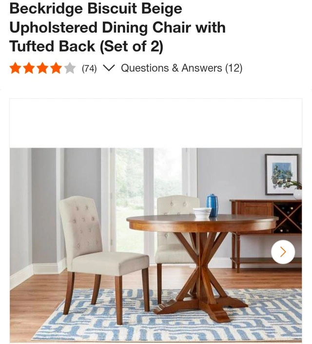 Add a touch of elegance to your dining space with this set of two Beckridge biscuit beige upholstered dining chairs, each featuring a stylish tufted back. These chairs are brand new, ready to bring comfort and sophistication to your dining experience. Transform your dining area with these charming chairs. If the ad is up, they're still available!
