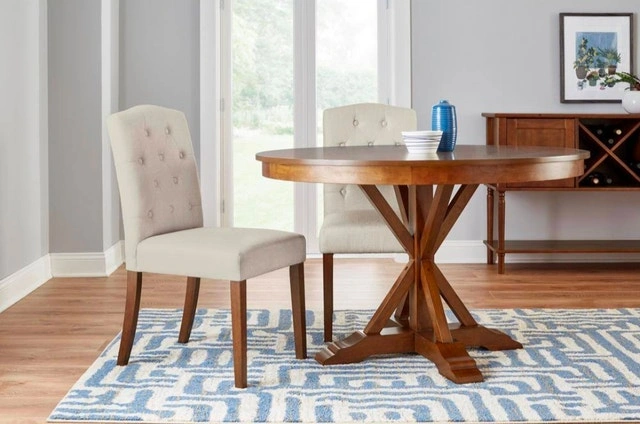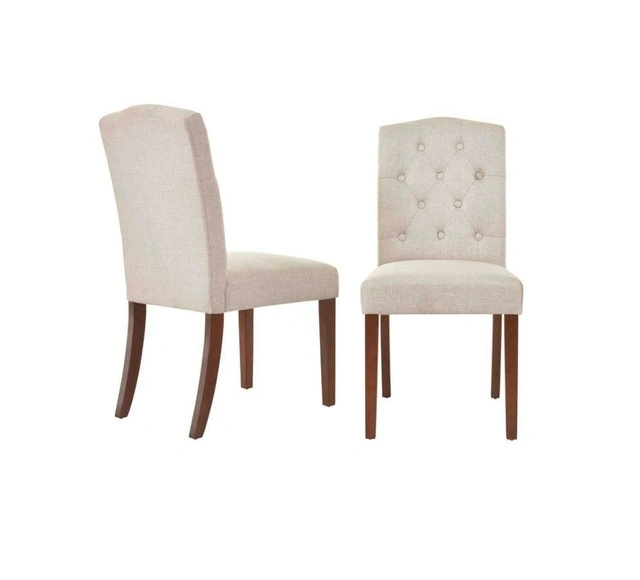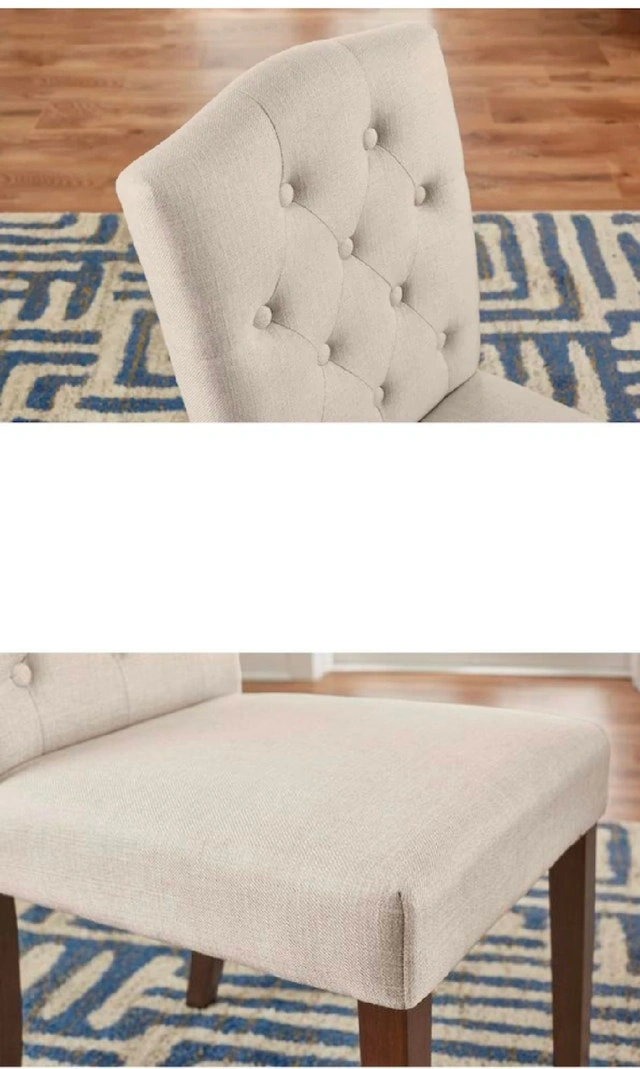Add a touch of elegance to your dining space with this set of two Beckridge biscuit beige upholstered dining chairs, each featuring a stylish tufted back. These chairs are brand new, ready to bring comfort and sophistication to your dining experience. Transform your dining area with these charming chairs. If the ad is up, they're still available!