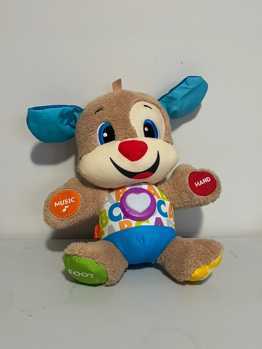Fisher-Price Laugh & Learn Smart Puppy teaches baby letters, colours, numbers, and more. It has soft fur and a light-up tummy. Different buttons on its paws and feet are labelled 'Music', 'Hand', 'Foot', and 'Press'.