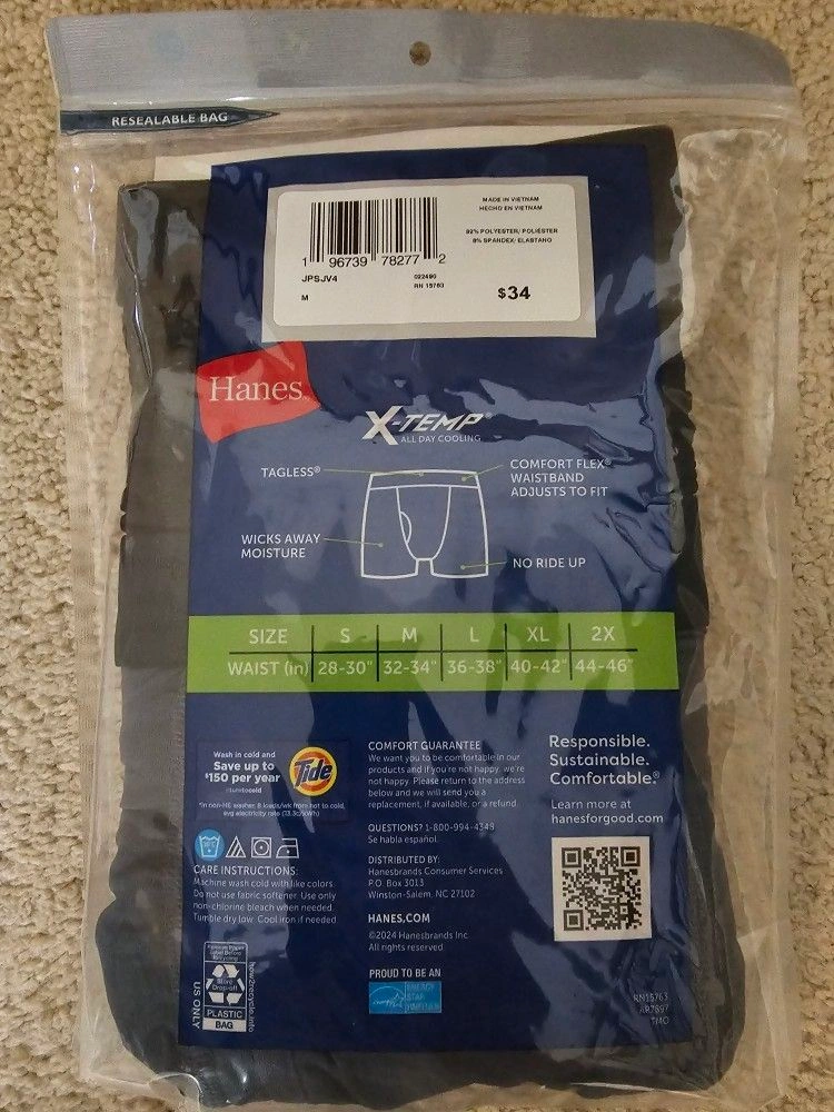 Hanes X-TEMP 4 Pack Tagless Boxer Briefs. Performance Stretch. Size Medium - fits 32"-34". Includes 2 pairs in Black and 2 pairs in Gray. I have 2 packs available, all the same size and color. Material: Polyester.