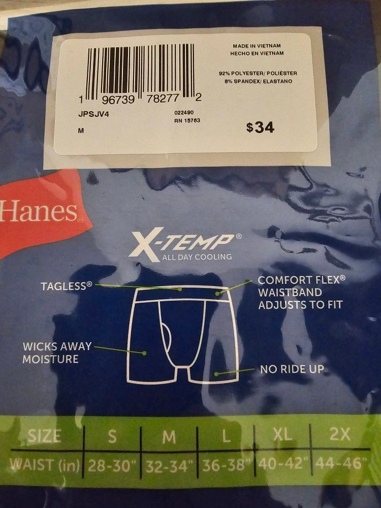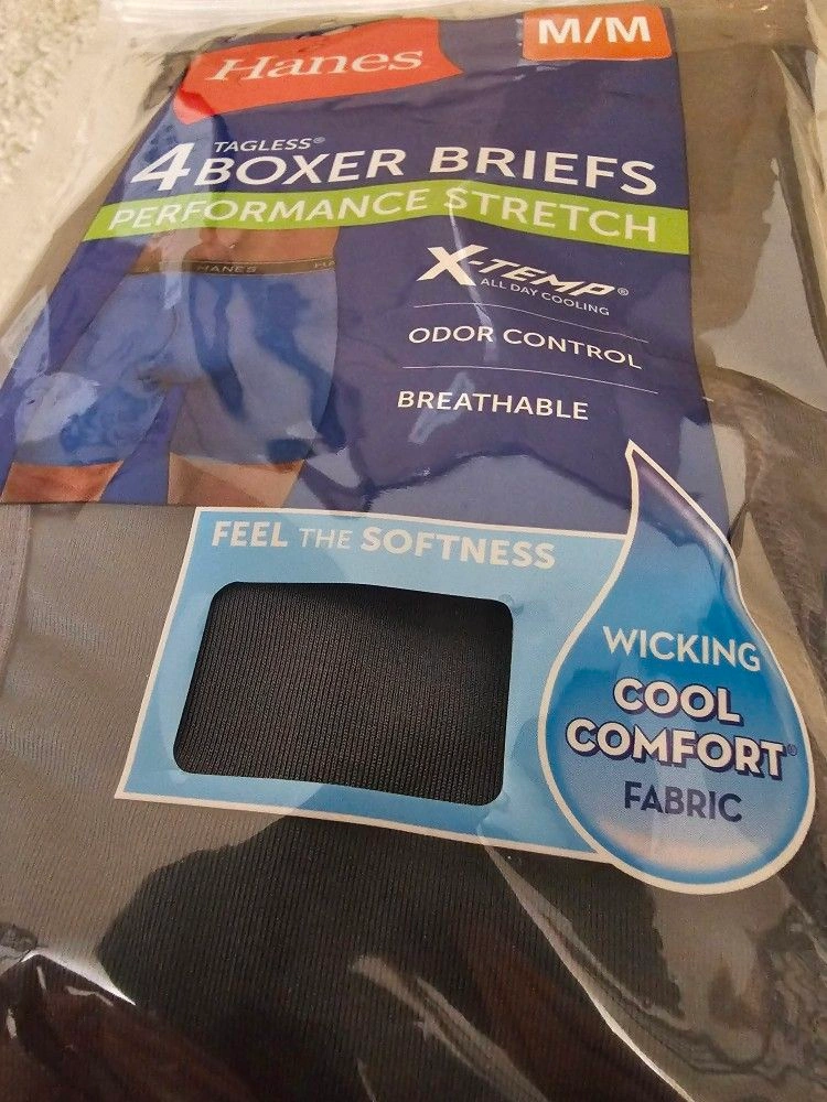 Hanes X-TEMP 4 Pack Tagless Boxer Briefs. Performance Stretch. Size Medium - fits 32"-34". Includes 2 pairs in Black and 2 pairs in Gray. I have 2 packs available, all the same size and color. Material: Polyester.