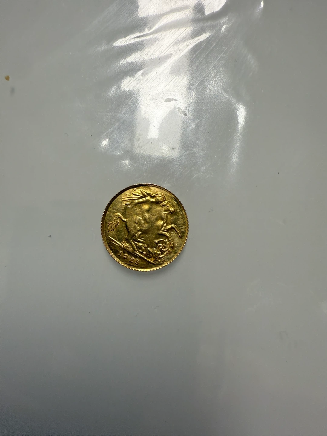 This is a 1925 Gold Sovereign coin. It features King George V on the obverse and the St George and the Dragon design on the reverse. Coin is gold. 1g 22k