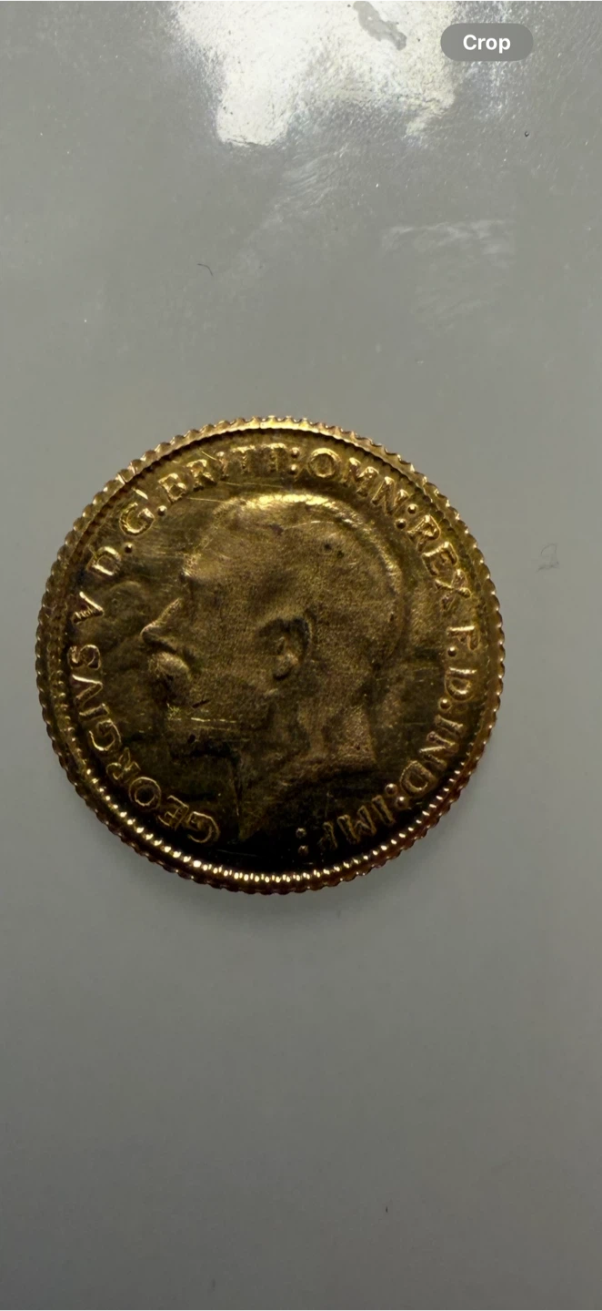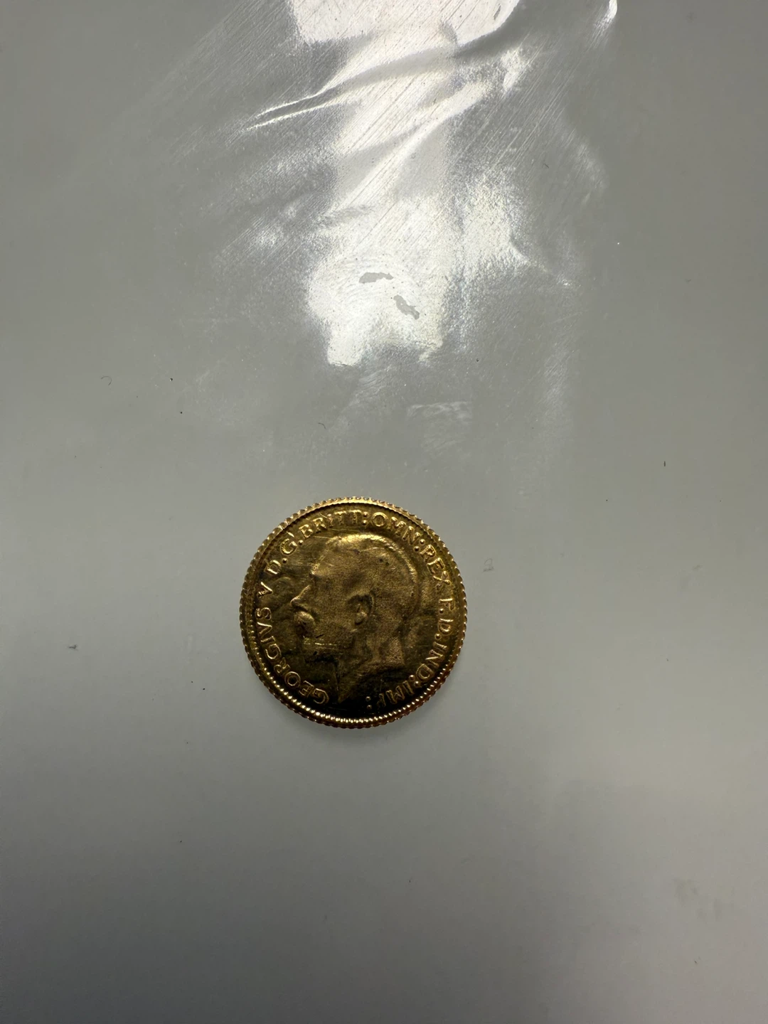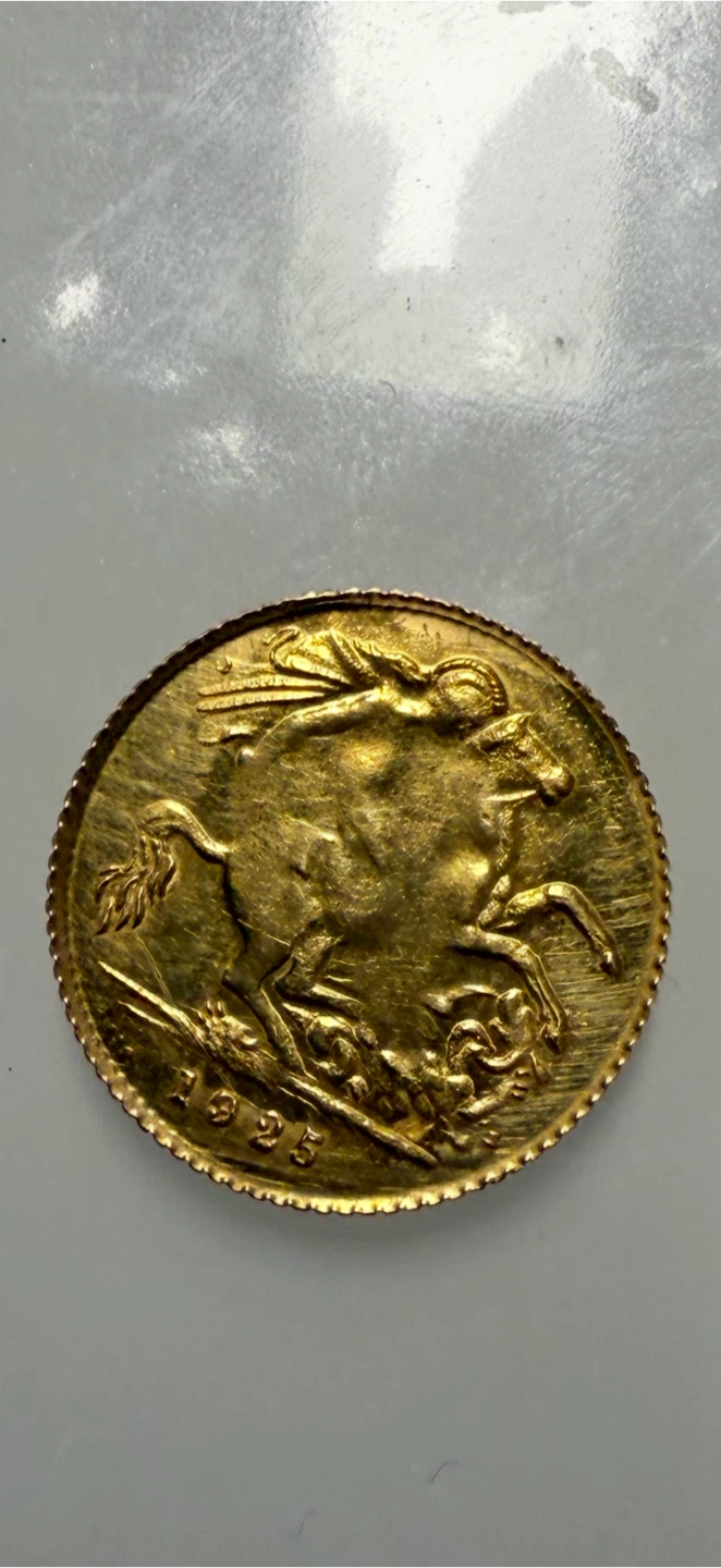This is a 1925 Gold Sovereign coin. It features King George V on the obverse and the St George and the Dragon design on the reverse. Coin is gold. 1g 22k