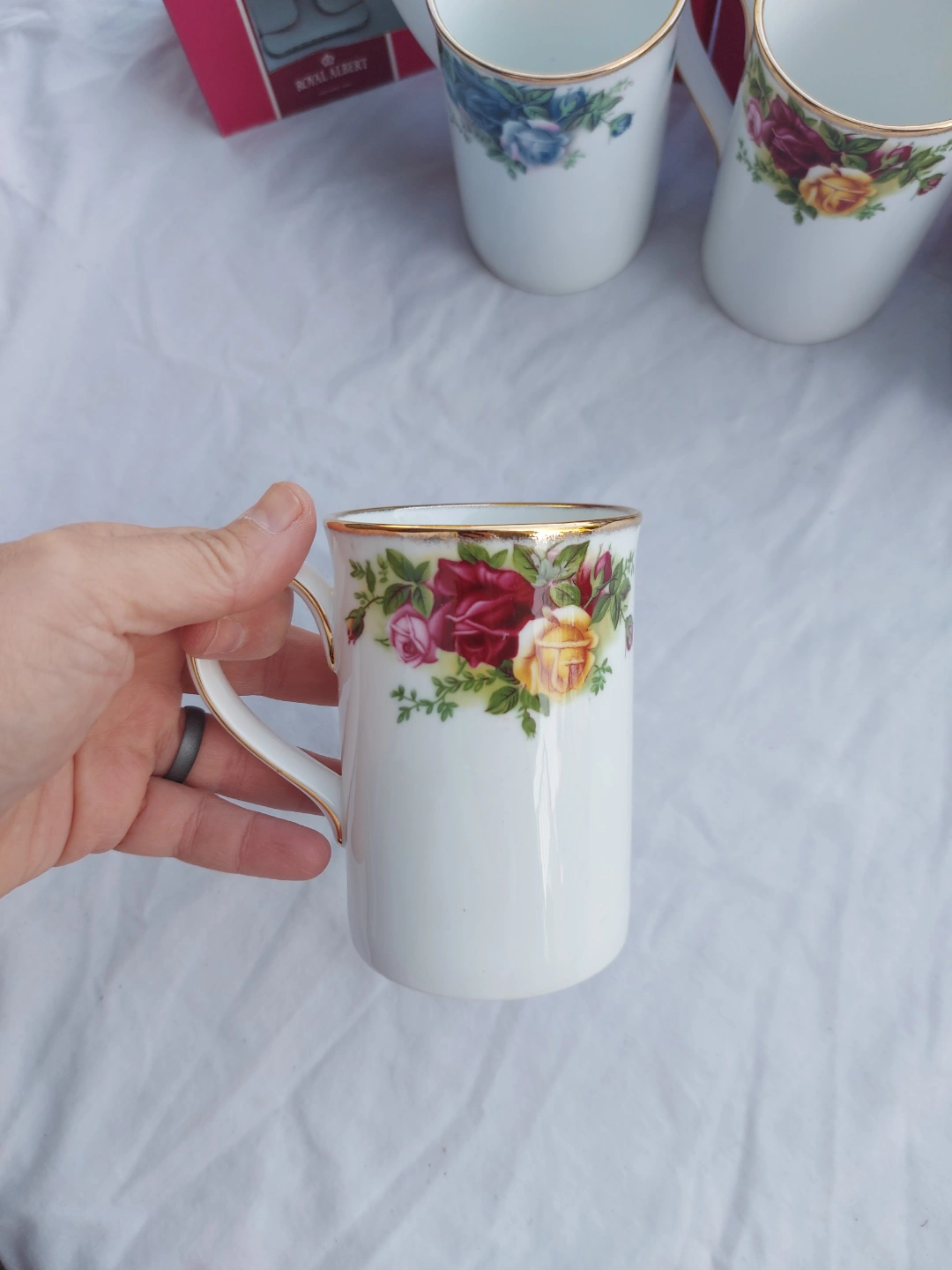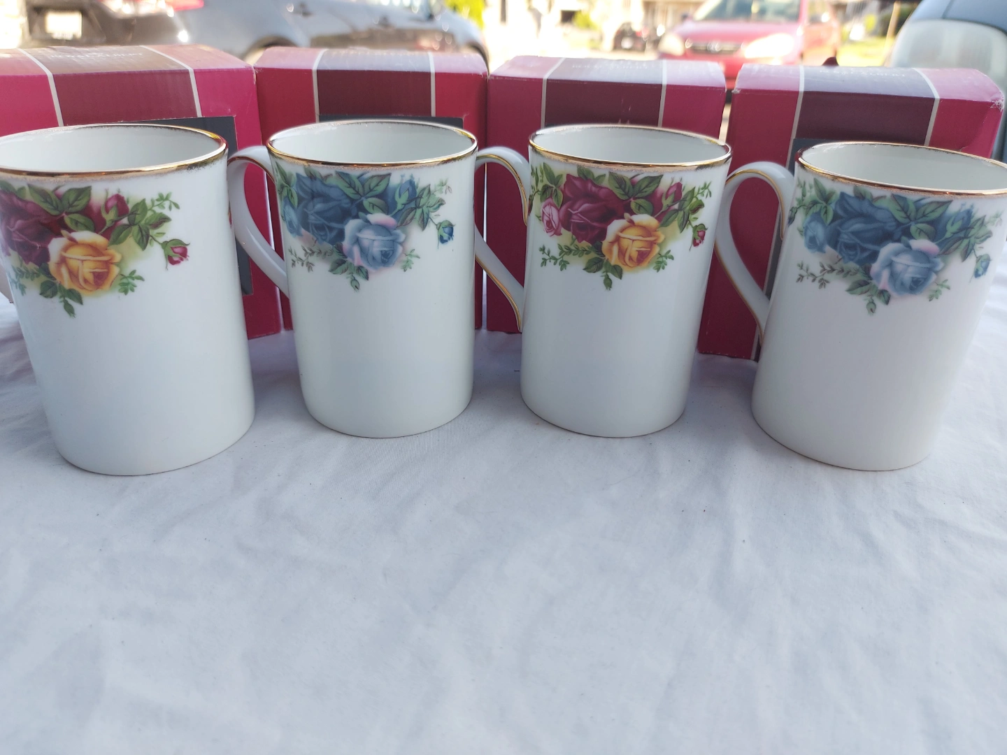 These are a set of four Royal Albert collectible mugs, each holding 8 fl oz and adorned with a beautiful floral design and gold trim. These mugs are in excellent condition and come with their original boxes, making them a perfect addition to any collection or a delightful way to enjoy your daily brew. These mugs have been previously owned, never used, but are in great shape.