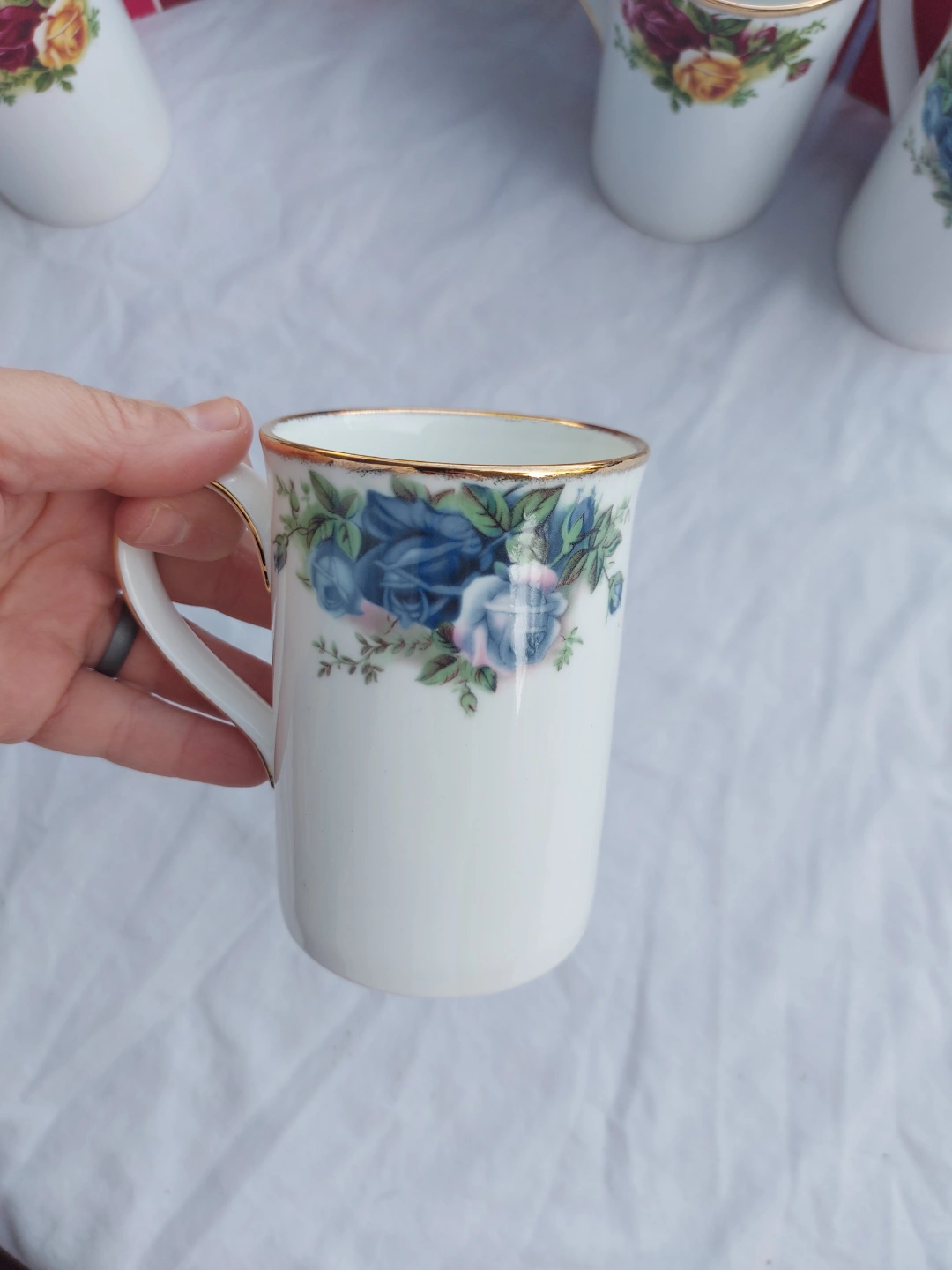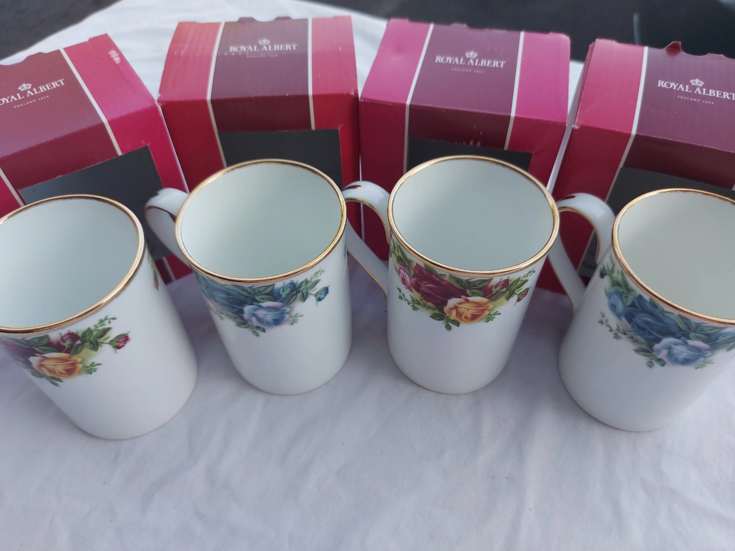 These are a set of four Royal Albert collectible mugs, each holding 8 fl oz and adorned with a beautiful floral design and gold trim. These mugs are in excellent condition and come with their original boxes, making them a perfect addition to any collection or a delightful way to enjoy your daily brew. These mugs have been previously owned, never used, but are in great shape.
