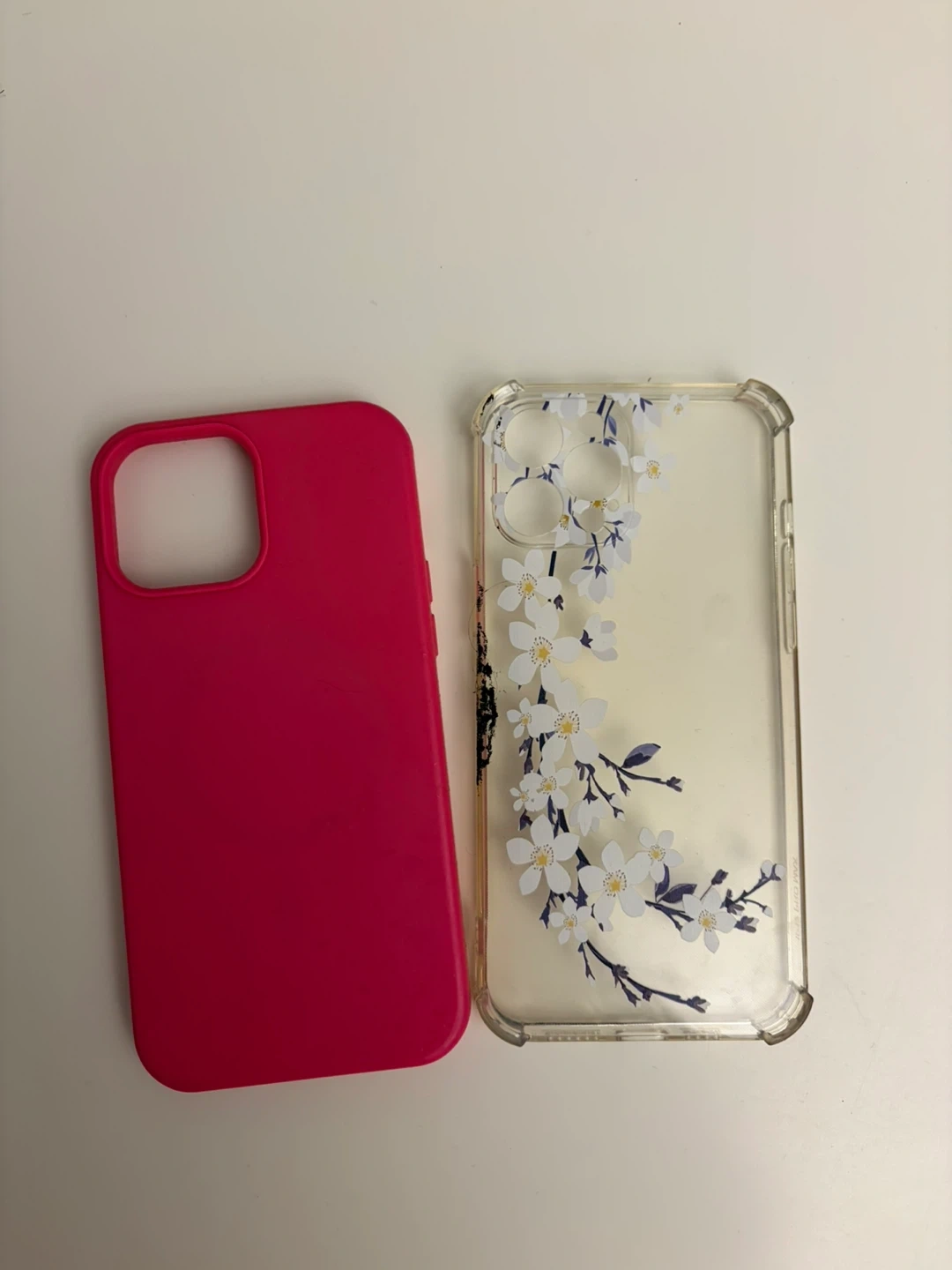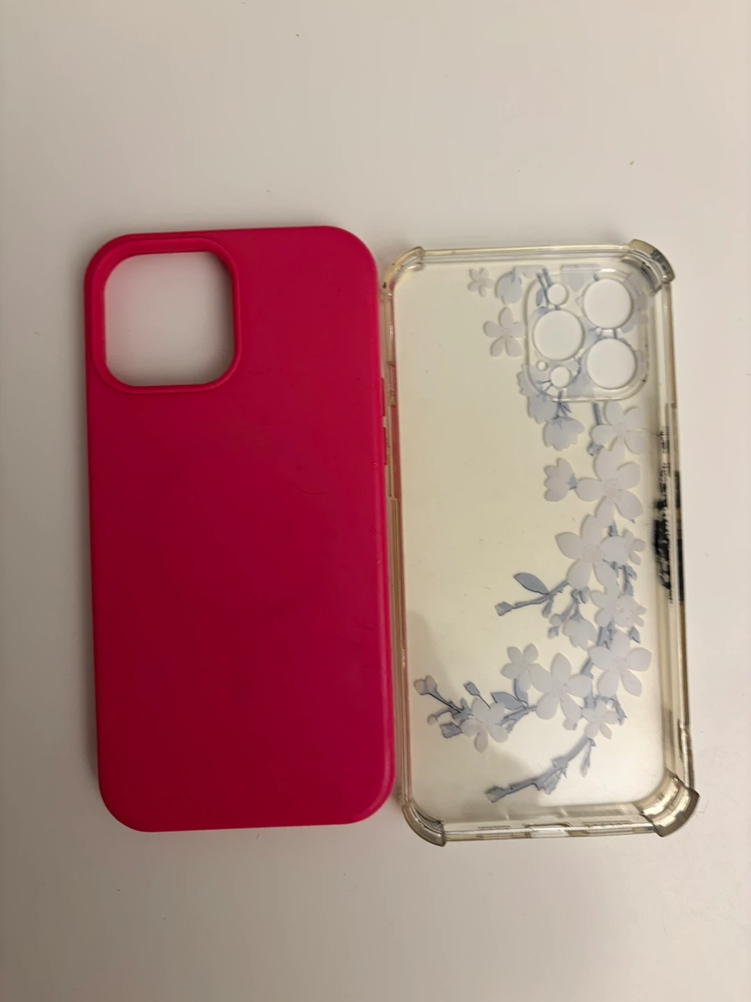 This lot includes a bright pink silicone case and a clear case with a blue floral design.