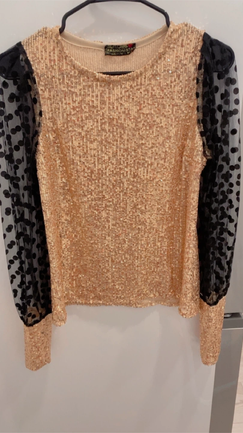 A fashionista sequin top! It features a gold sequin body and stylish black polka dot sleeves. Perfect for a night out or a special occasion.