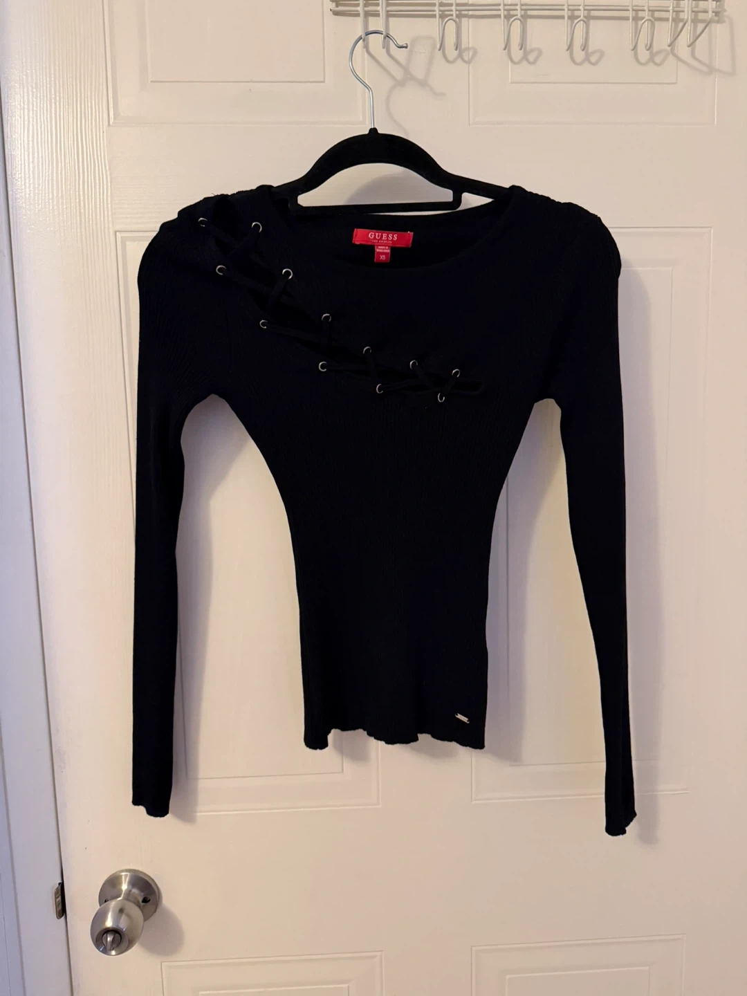 This Guess sweater is black with a ribbed texture. It features a unique lace-up detail on the front neckline.