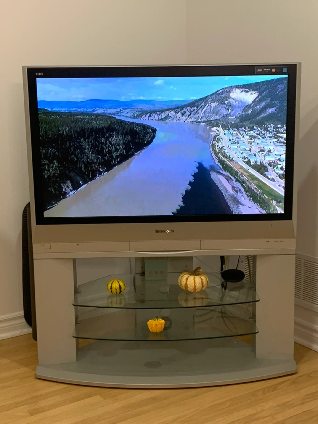 A Panasonic flat screen television with a stand. It has multiple glass shelves for storage. This TV is a great addition to any living room or entertainment space!